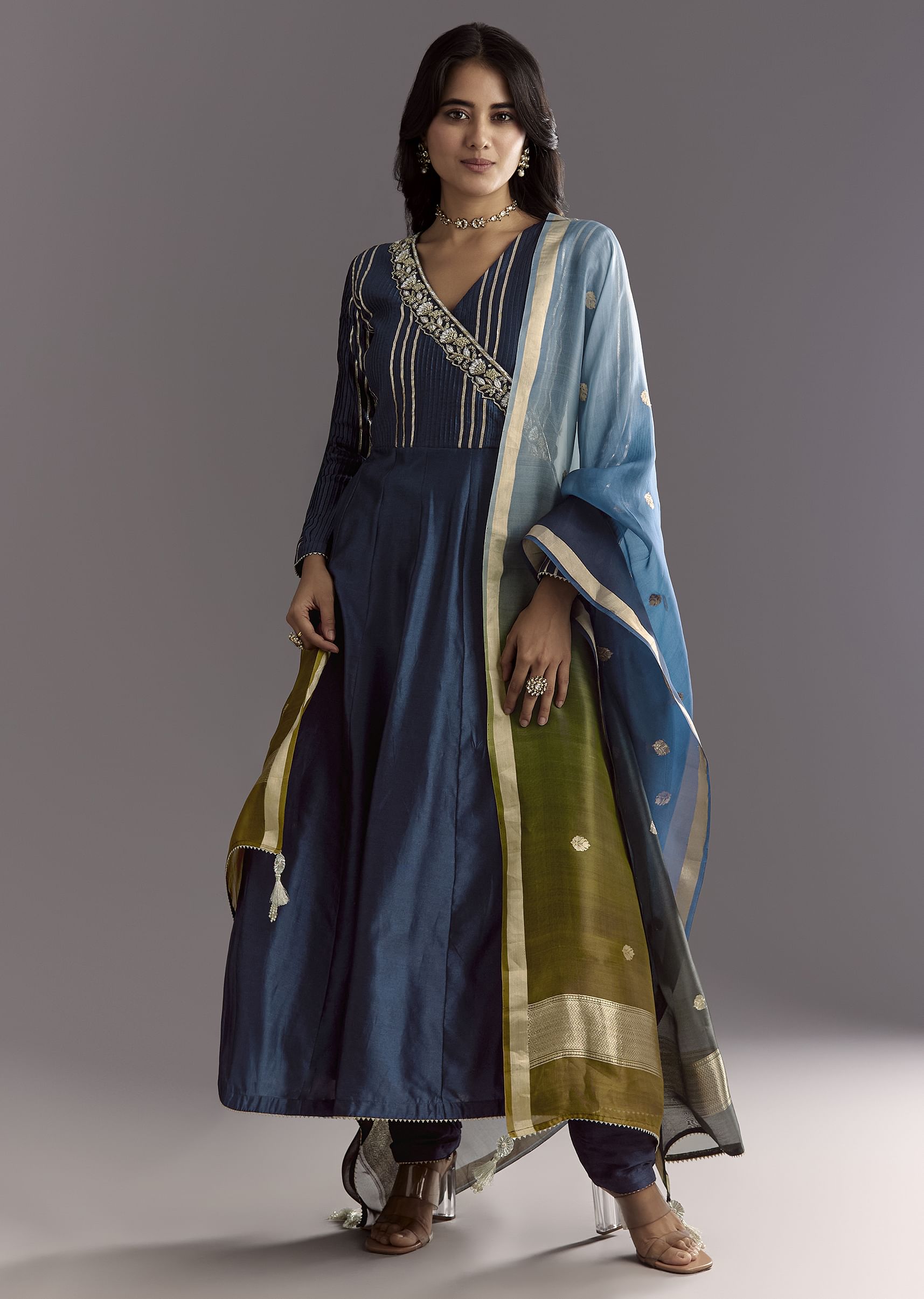 Blue Angrakha Style Anarkali Suit With Butti Work Ombre Dupatta