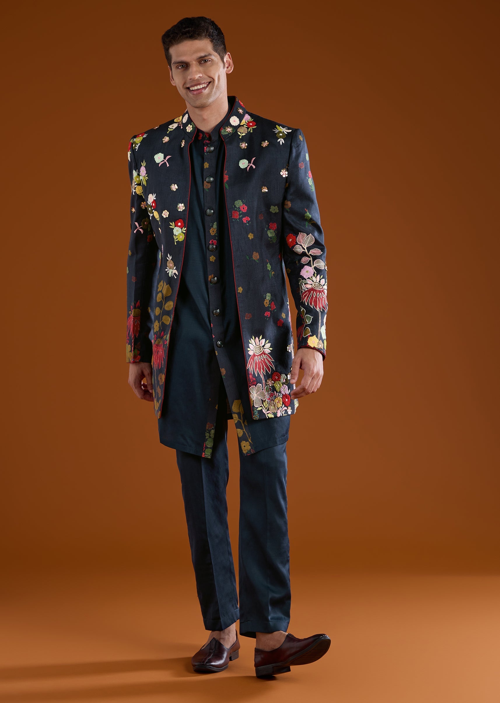 Pair it with embroidered juttis and a simple pocket square or brooch to enhance its elegant indowestern appeal.