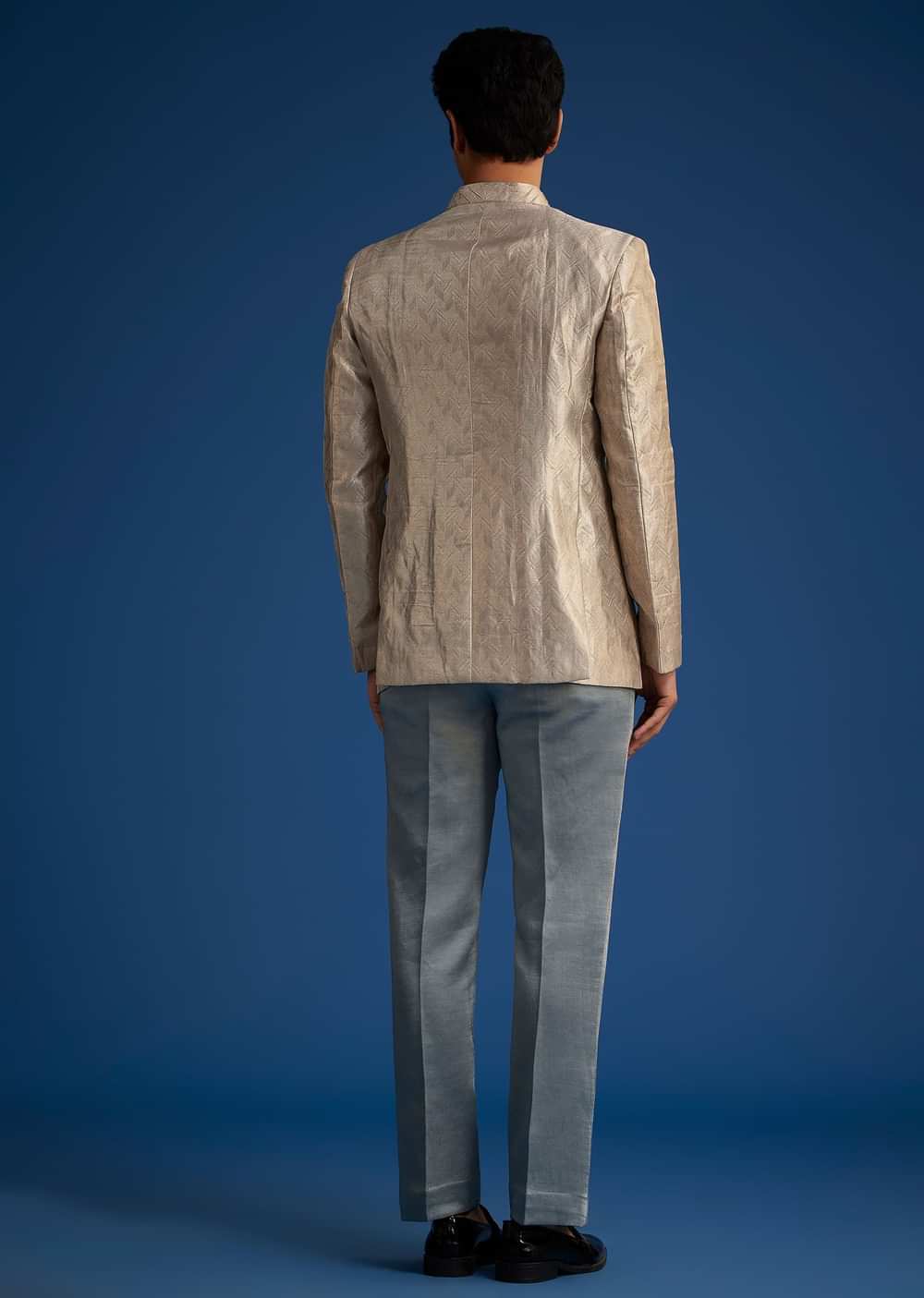 Elevate your royal charm with this blue Banarasi silk Jodhpuri suit, crafted with impeccable finesse. The brocade jacket boasts a refined pin tuck detailing and a distinctive double collar, adding... More Product Details