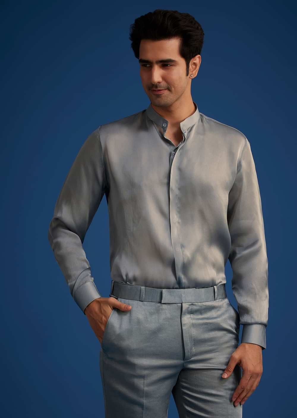 Elevate your royal charm with this blue Banarasi silk Jodhpuri suit, crafted with impeccable finesse. The brocade jacket boasts a refined pin tuck detailing and a distinctive double collar, adding a modern touch to its regal silhouette. Paired with a subtly shaded organza satin shirt and linen satin trousers, this ensemble is a statement of understated luxury. Perfect for weddings, receptions, and elite gatherings.Awarded as the Most Trusted Brand, we're delivering styles you love, just as promised.