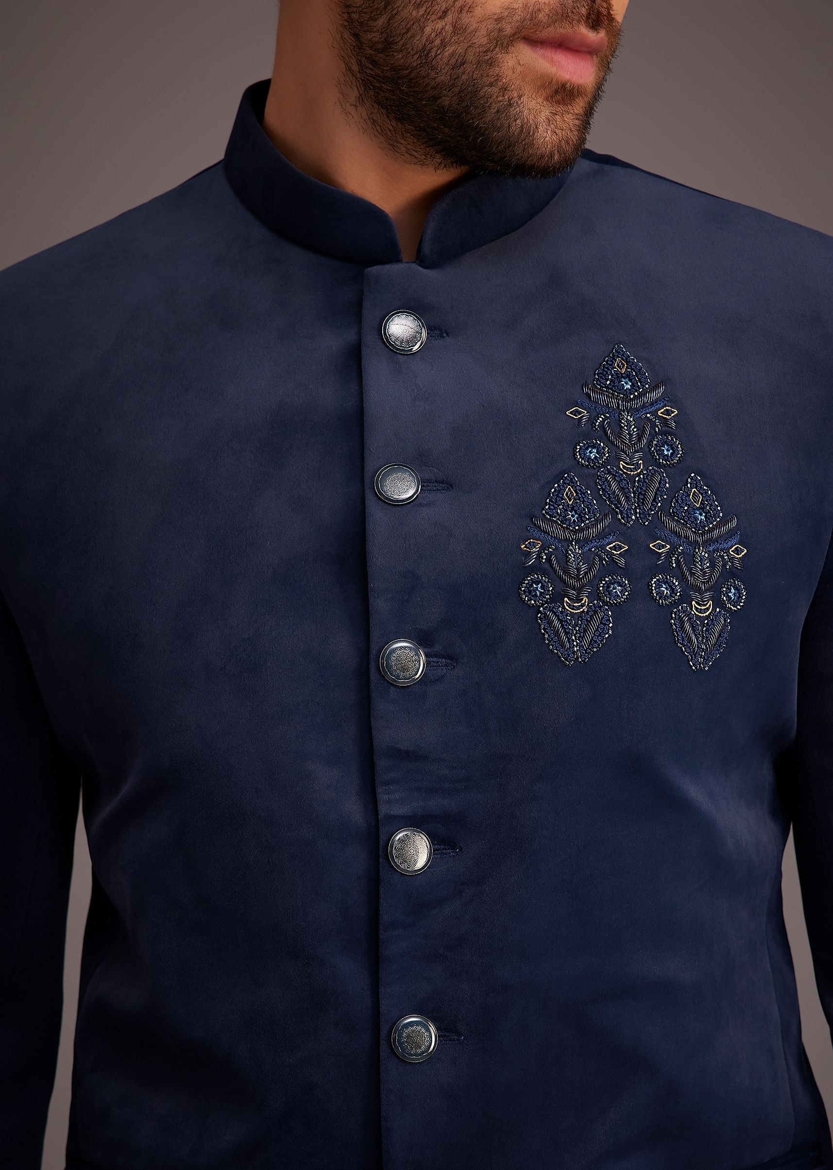 This exquisite bandhgala features a rich blue hue adorned with an intricately embroidered motif offering a perfect balance of elegance and style. The luxurious fabric and structured silhouette make it... More Product Details