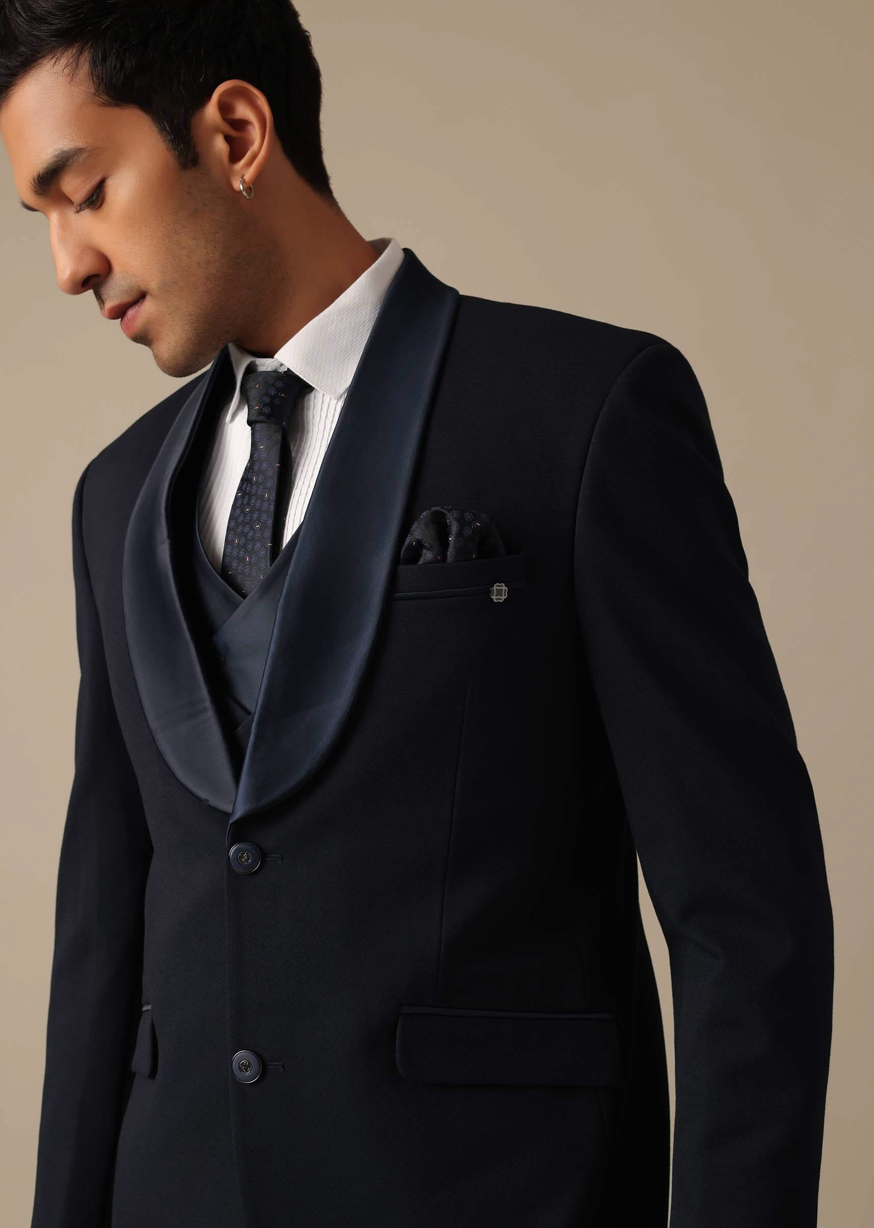 Showcasing our dapper blue suit set that features a detailed criss-cross pattern on the tuxedo and striking shawl collar. Tailored to perfection this ensemble is paired with matching trousers, a stylish tie, coordinating shirt and waistcoat. An epitome of elegance, don it at the next cocktail party to steal the spotlight. Awarded as the Most Trusted Brand, we're delivering styles you love, just as promised.
