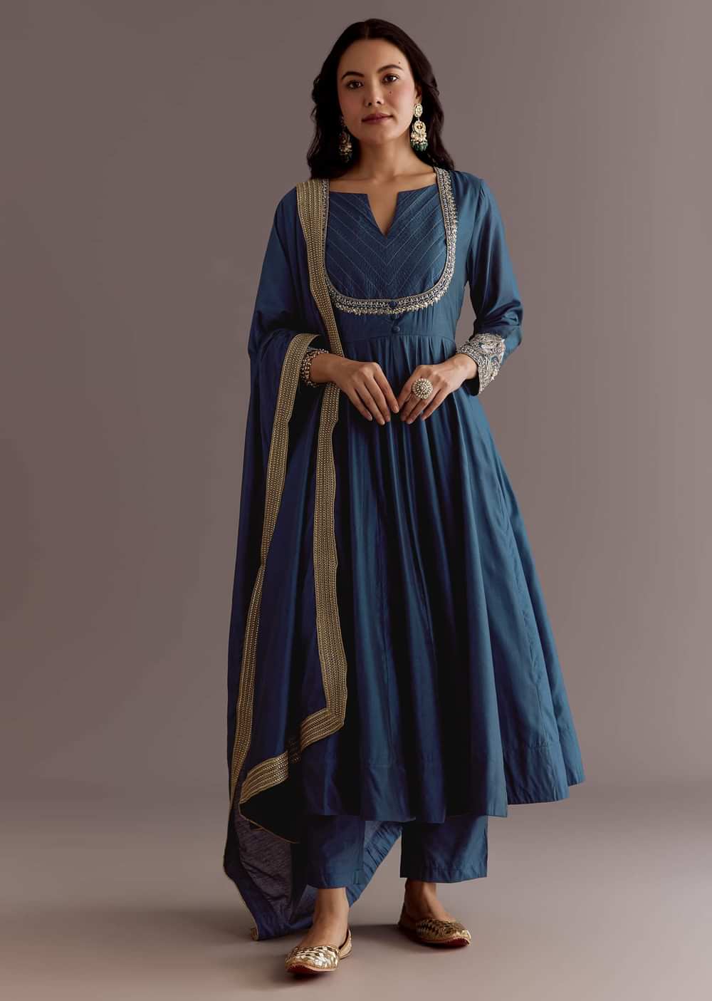 This ocean-blue anarkali, crafted in chanderi, is adorned with glowing moti and delicate gotta work. Its dupatta drapes like a breeze of blessings—soft and sparkly. Standard length for the anarkali... More Product Details