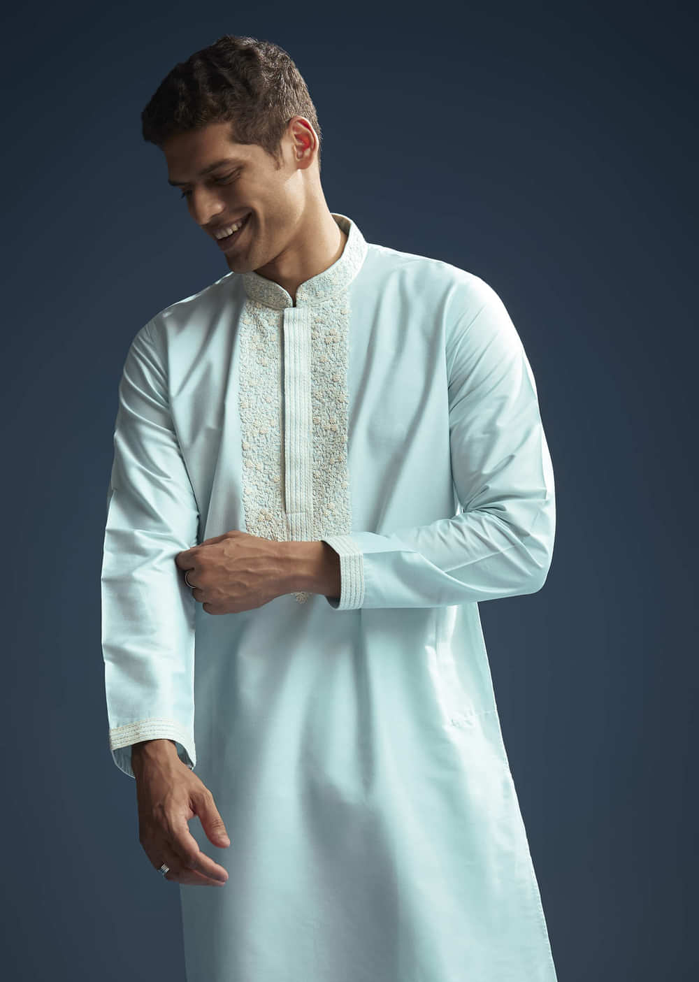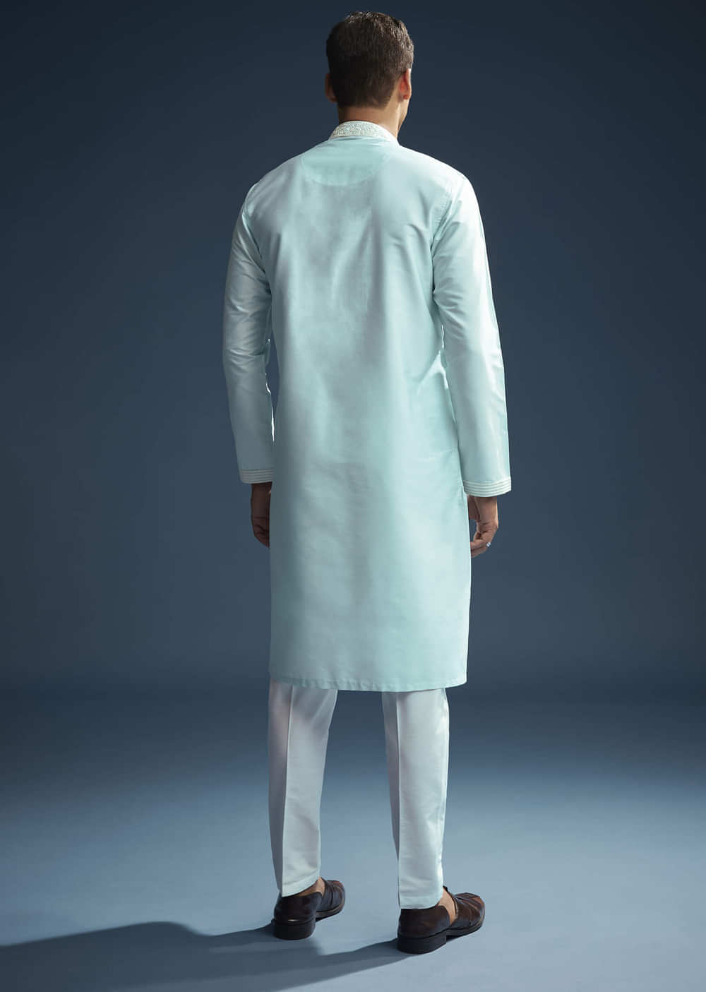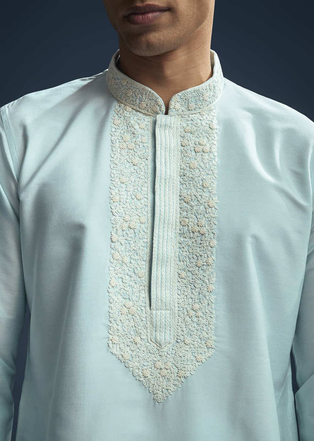 Blue Chanderi Kurta Set For Men With Kashmiri Hand Work