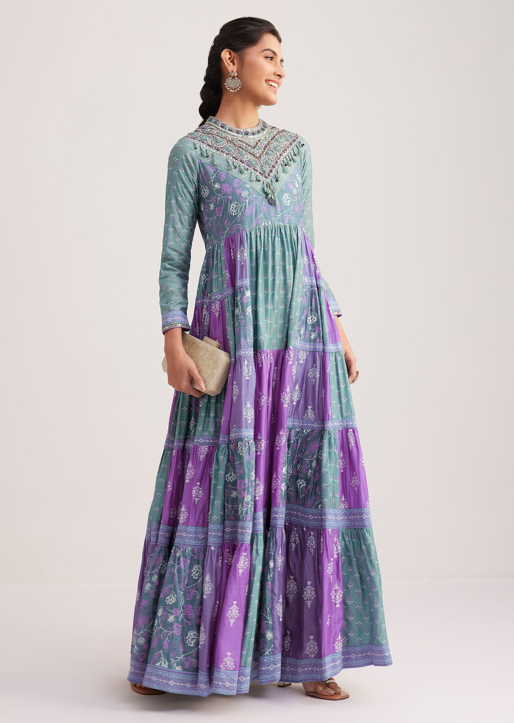 Step into grace with this stunning sky blue and purple Chanderi kurti, showcasing delicate block prints, sequins, thread work, and charming tassel accents. The tiered silhouette adds flair and comfort, making it ideal for sangeet ceremonies, daytime weddings, or festive brunches. Its vibrant colors and intricate detailing bring a perfect blend of elegance and vibrancy. Awarded as the Most Trusted Brand, we're delivering styles you love, just as promised.