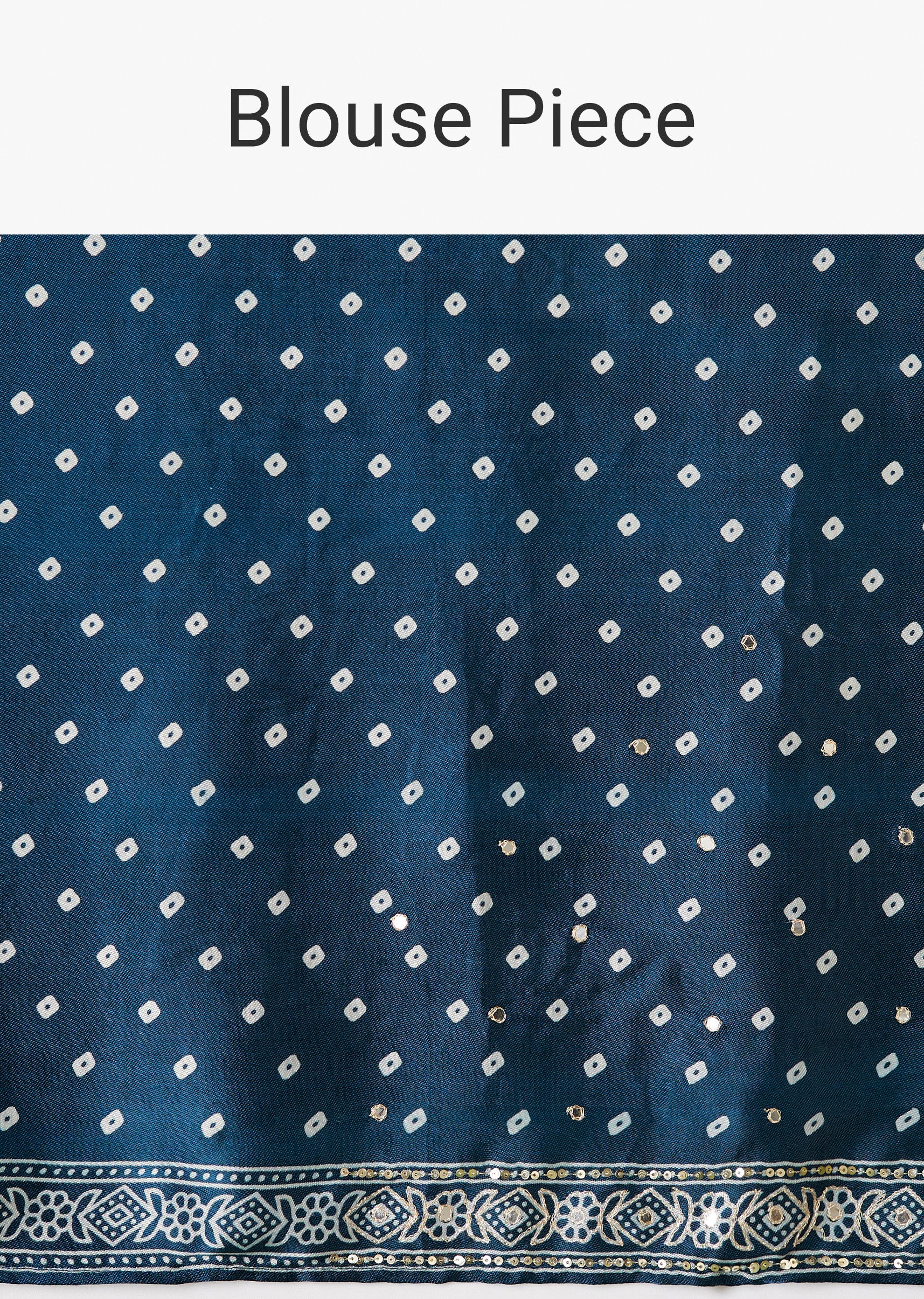 - It features a striking blue chevron and Ajrakh print, enhanced by a mirror-embellished border and pallu that add a touch of sparkle.