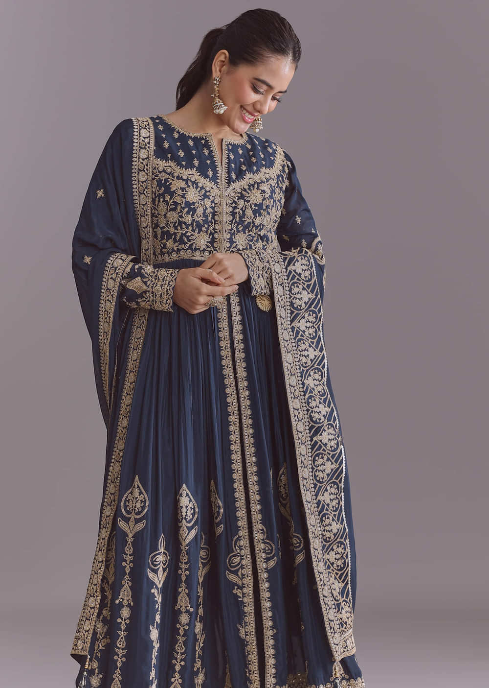 Blue Chinon Anarkali Suit With Embroidery And Front Slit