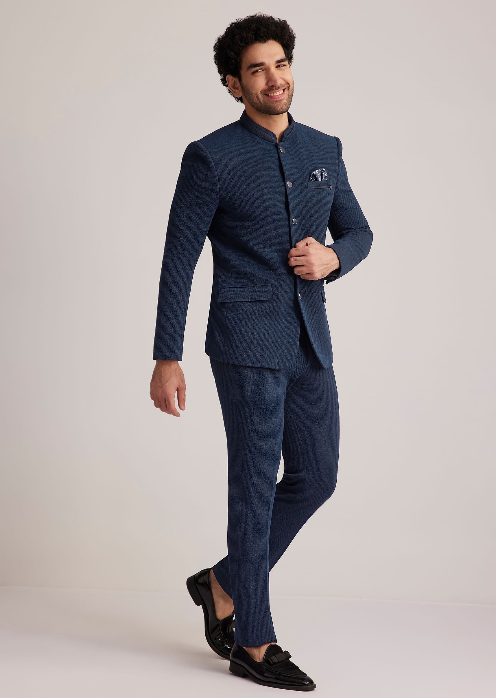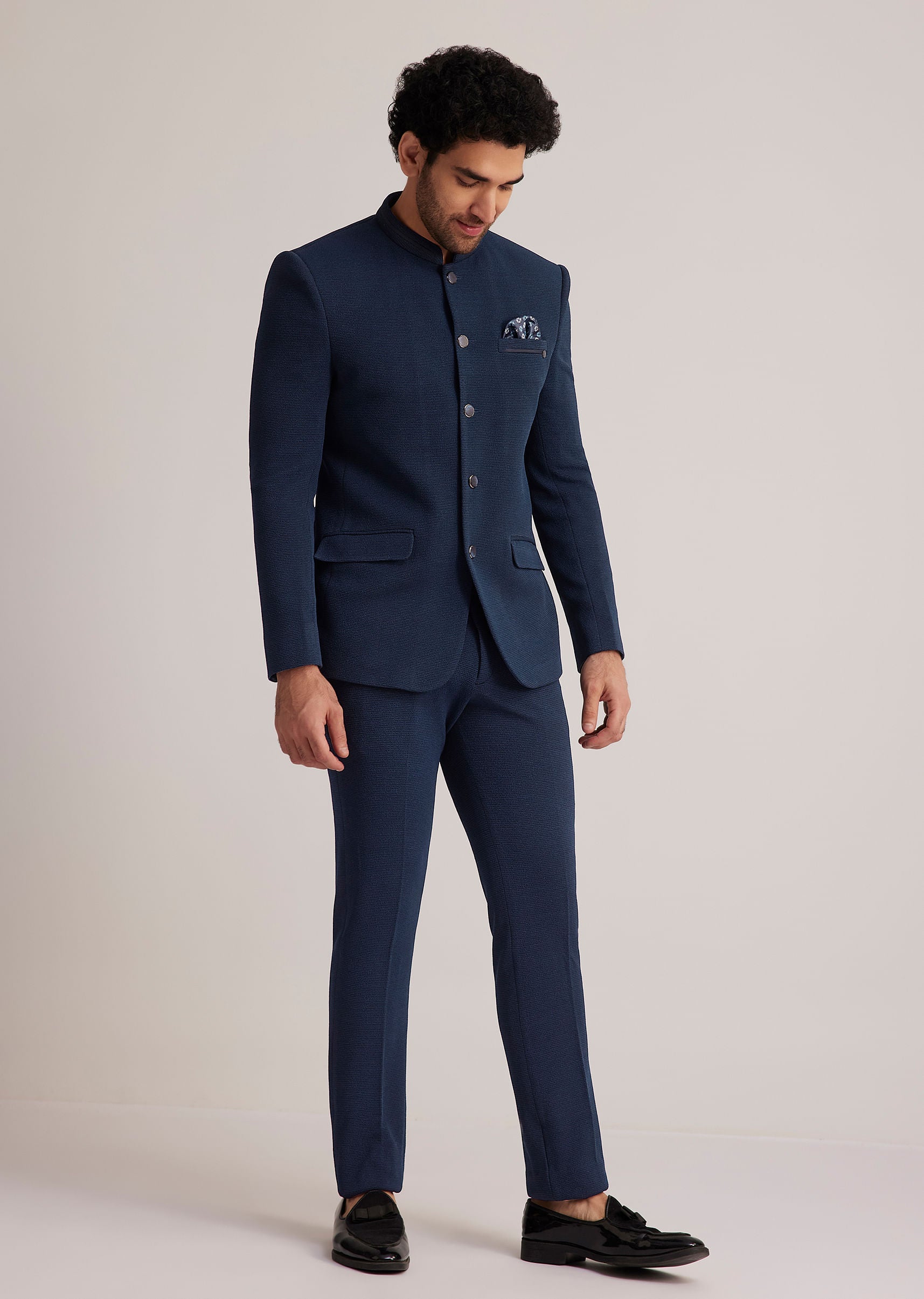 - Exude timeless sophistication with this blue bandhgala suit, designed with a structured fit and impeccable tailoring.