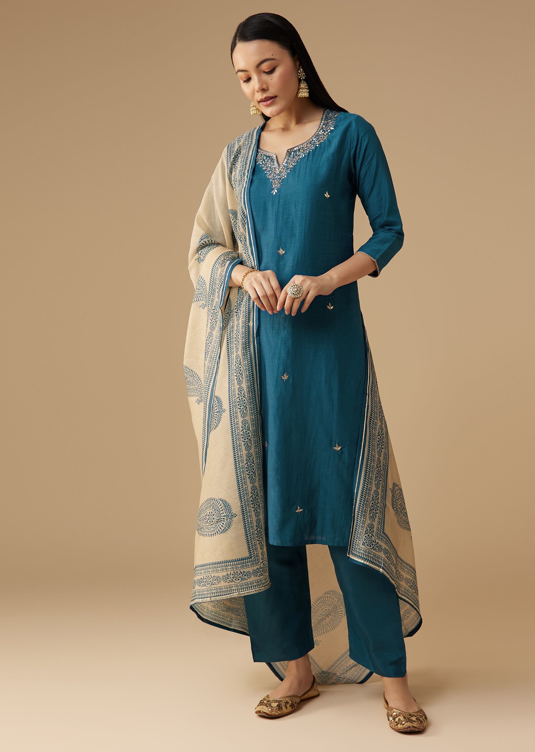 Elevate your festive dressing with this vivid blue kurta set, detailed with elegant gotta and zari work that brings a subtle sparkle to the classic silhouette. The soft cotton–cotton silk... More Product Details
