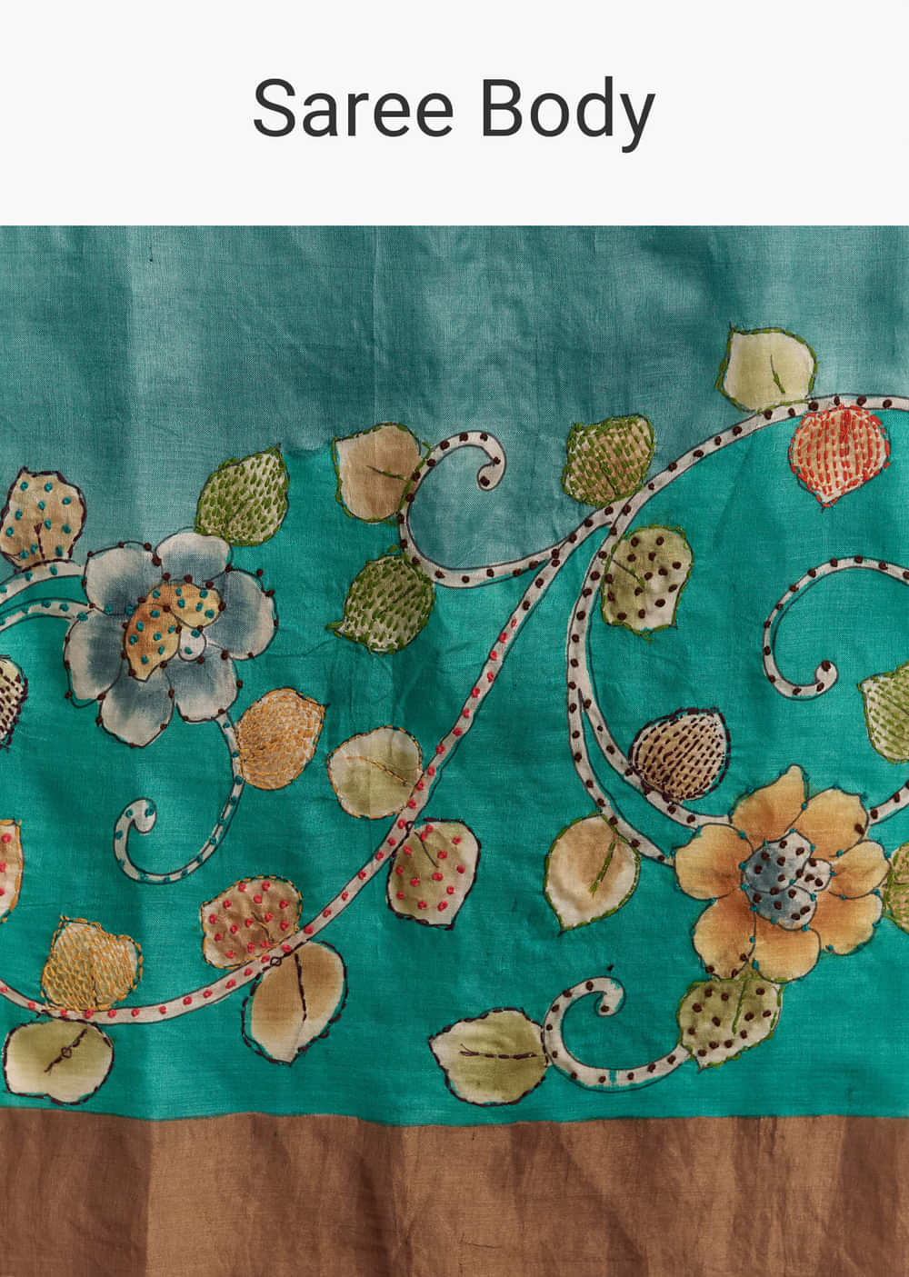 Turquoise shades give this blue cotton silk saree a fresh, vibrant feel while authentic hand painted motifs tell their own story. A brown border with Kantha stitches frames the artistry beautifully. It is a unique piece that carries craft and colour together with ease. Awarded as the Most Trusted Brand, we're delivering styles you love, just as promised.