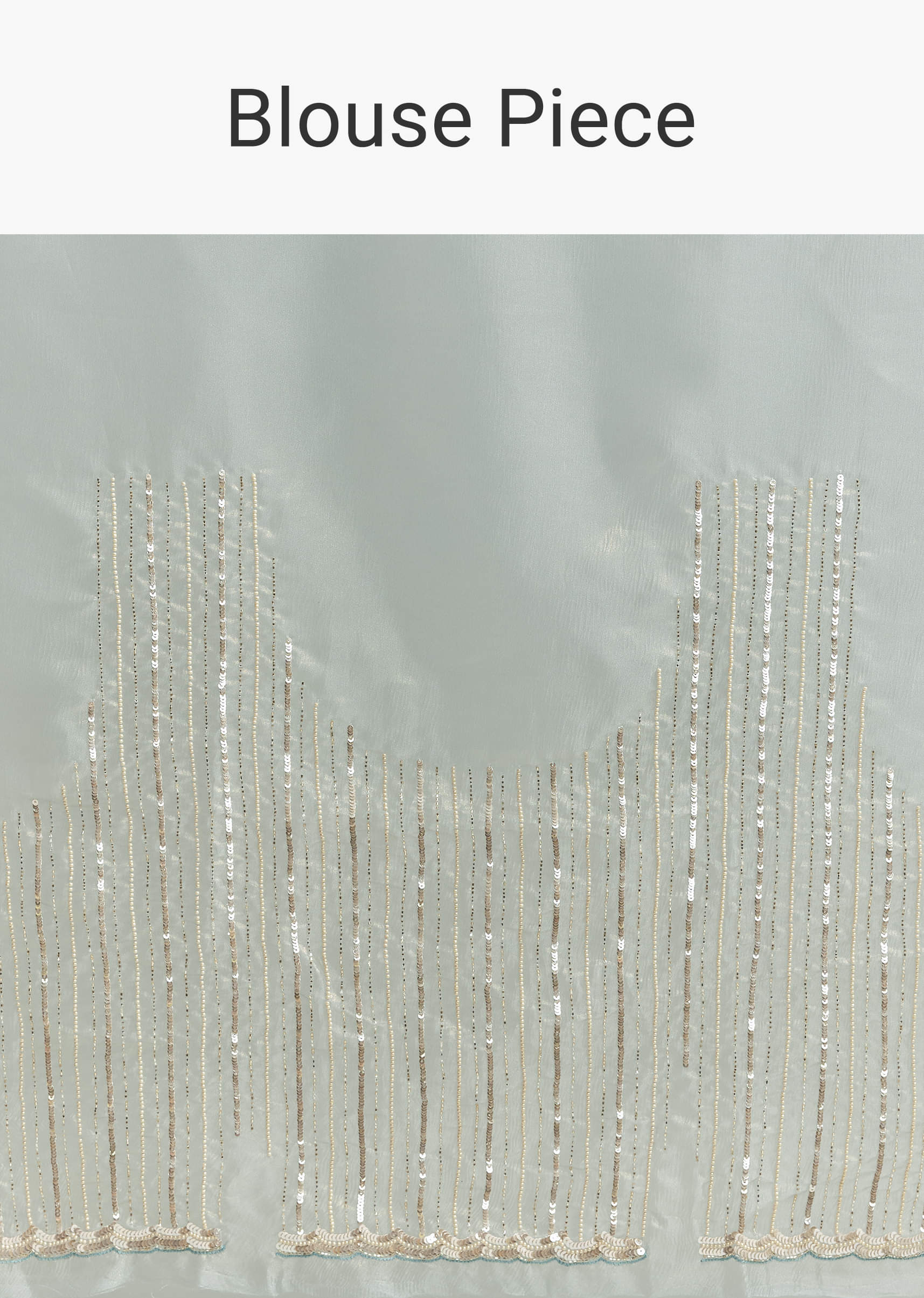 Wrapped in a dreamy hue, this blue crush tissue saree glistens with floral jaal embroidery that catches the eye from every angle. The blouse and saree are drenched in detail, with beads, sequins and cutdana adding rich dimension and festive drama. Its textured base lends an unconventional charm, perfect for those who love ornate with an edge. Bold yet regal, this one's a head-turner at any wedding event. Awarded as the Most Trusted Brand, we're delivering styles you love, just as promised.