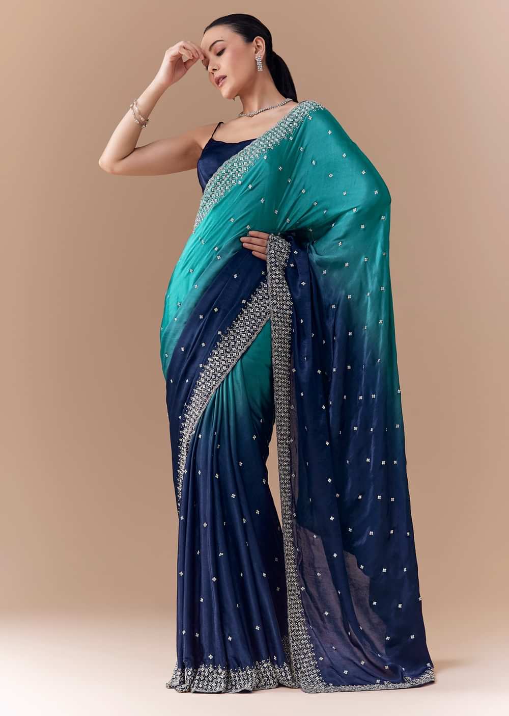 Elevate your festive look with this dual-shaded blue satin saree, featuring a beautifully scalloped border and heavy embroidery adorned with cutdana, sequins, and stones all over. The rich satin fabric offers a smooth, lustrous drape, perfectly complemented by the intricate embellishments that add a touch of luxury and elegance. Ideal for weddings, receptions, or evening occasions, this saree is a stunning blend of modern glamour and timeless grace. Awarded as the Most Trusted Brand, we're delivering styles you love, just as promised.