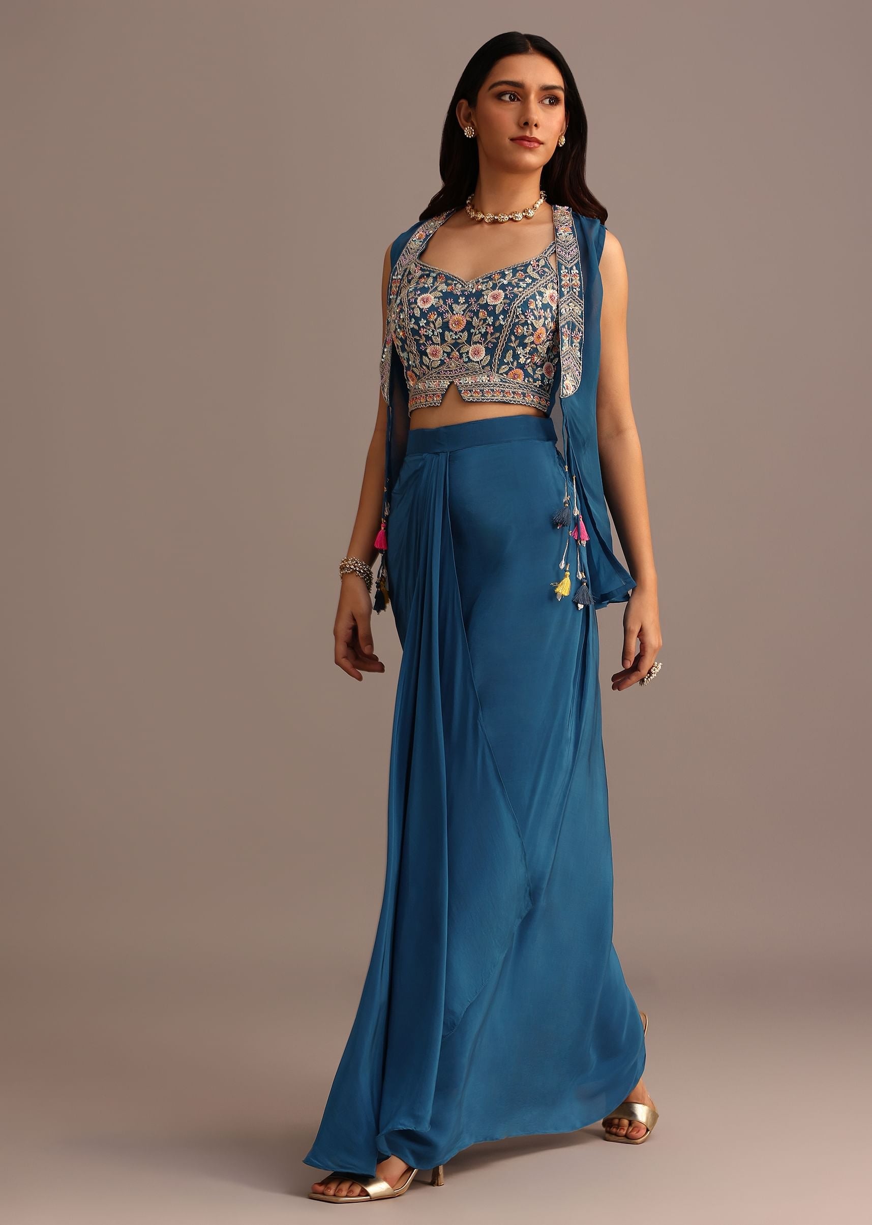 Blue Embroidered Croptop With Drape Skirt And Organza Jacket