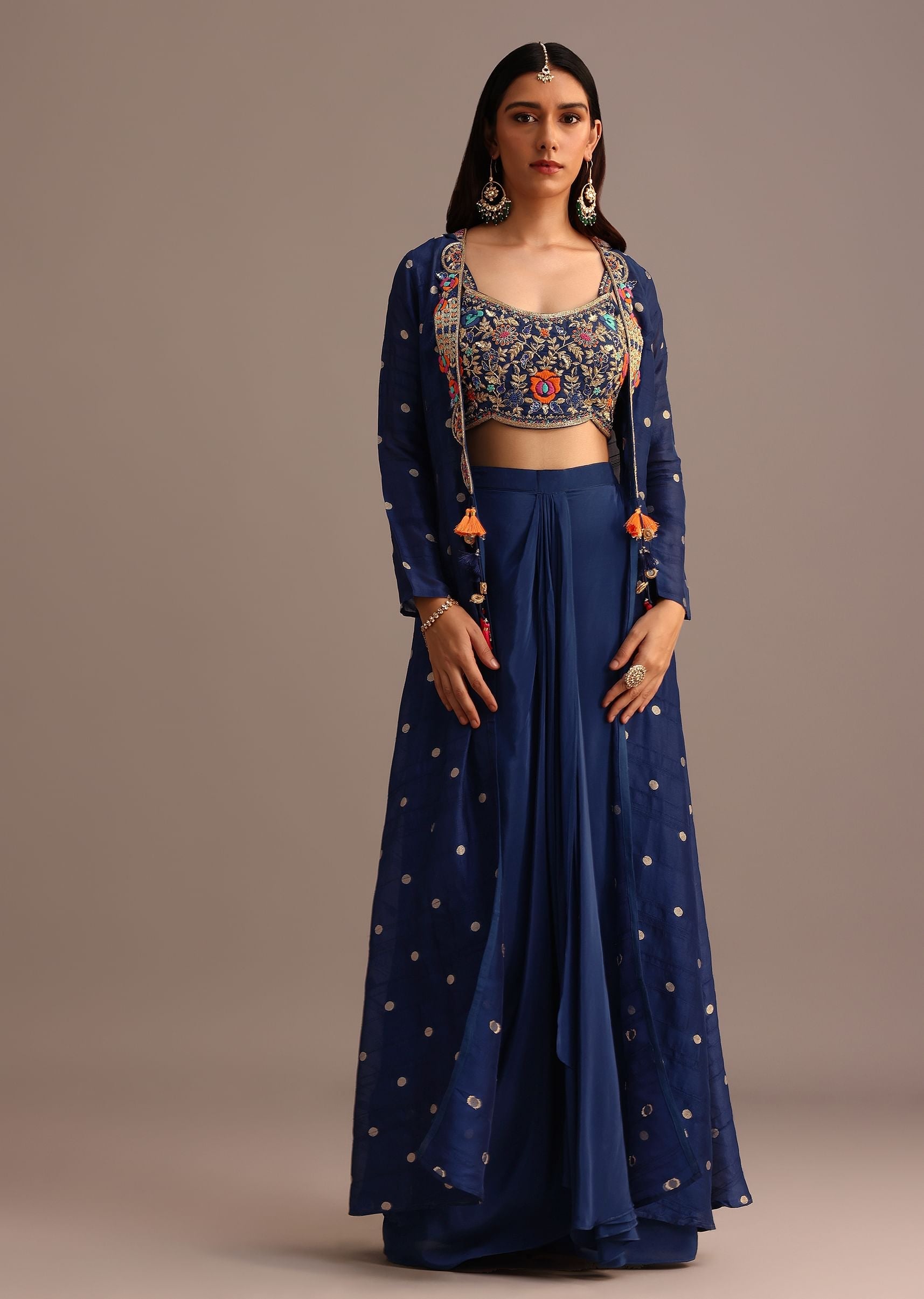 Blue Embroidered Croptop With Drape Skirt And Tussar Jacket