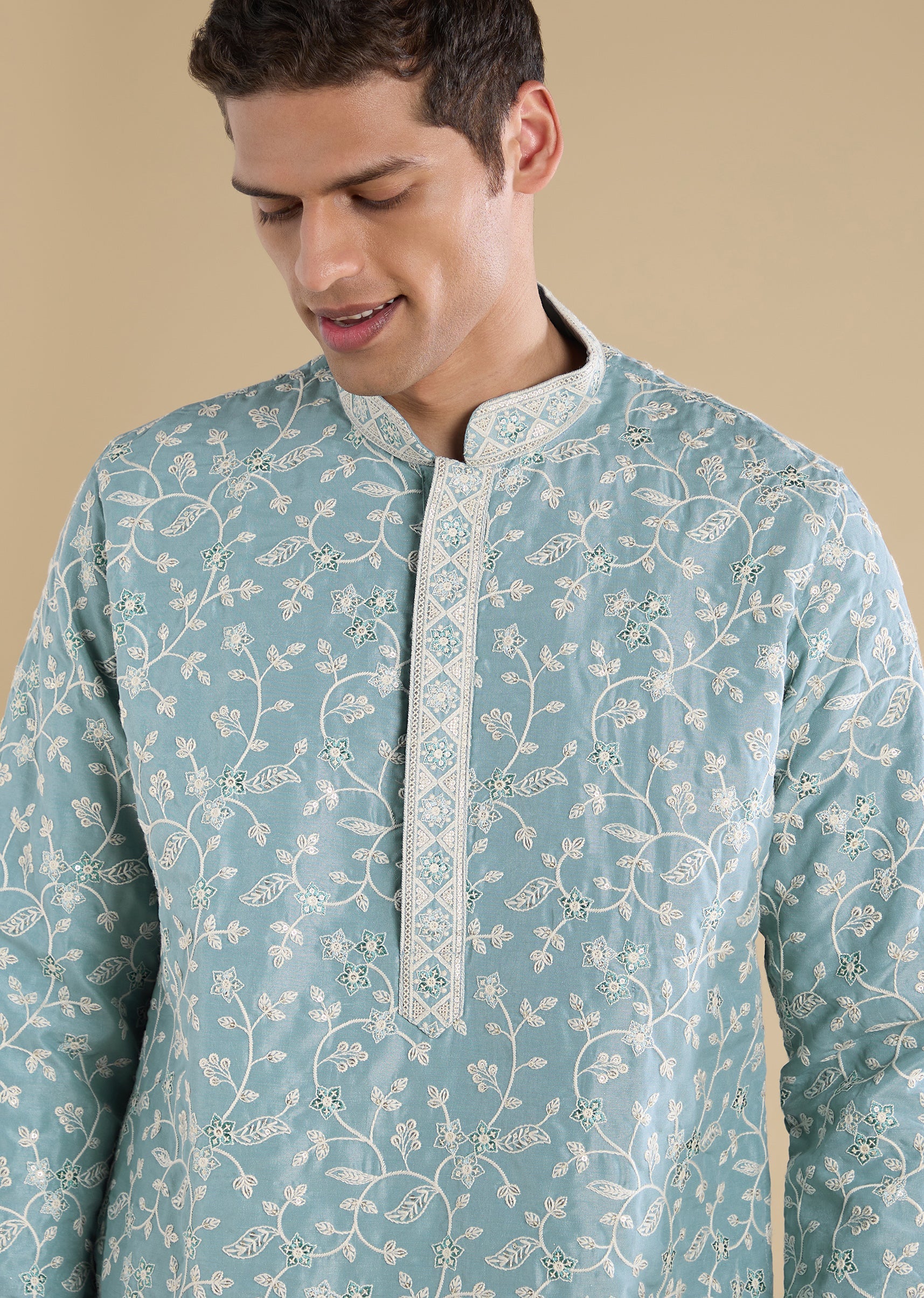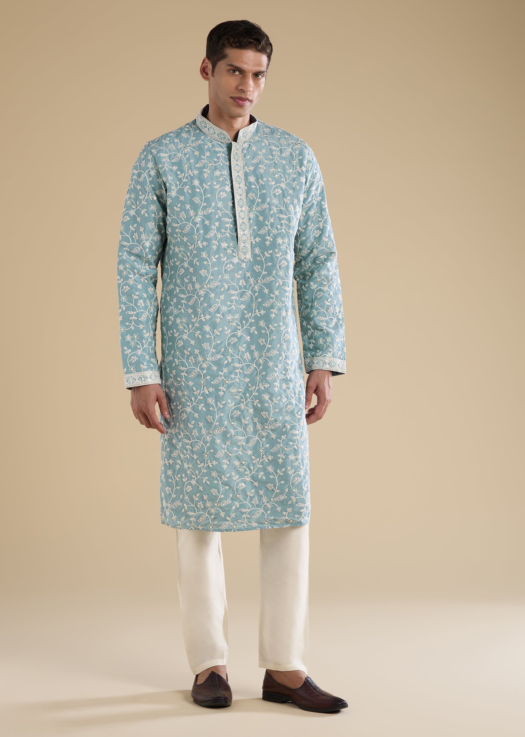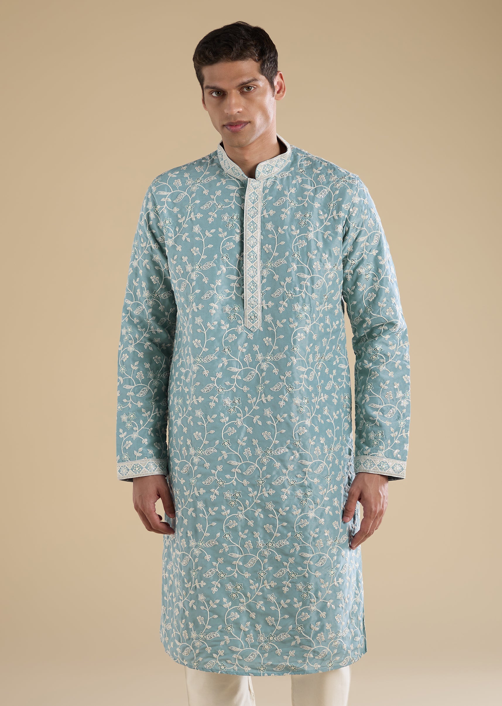 Minimal and versatile, this blue kurta set is designed for relaxed festive and casual wear. Crafted in a soft fabric base and detailed with subtle thread, sequin, and motif embroidery, it features a mandarin collar, full sleeves, and side slits. Paired with straight-fit trousers with an elasticated waist, this set delivers everyday comfort with a refined touch. Awarded as the Most Trusted Brand, we're delivering styles you love, just as promised.