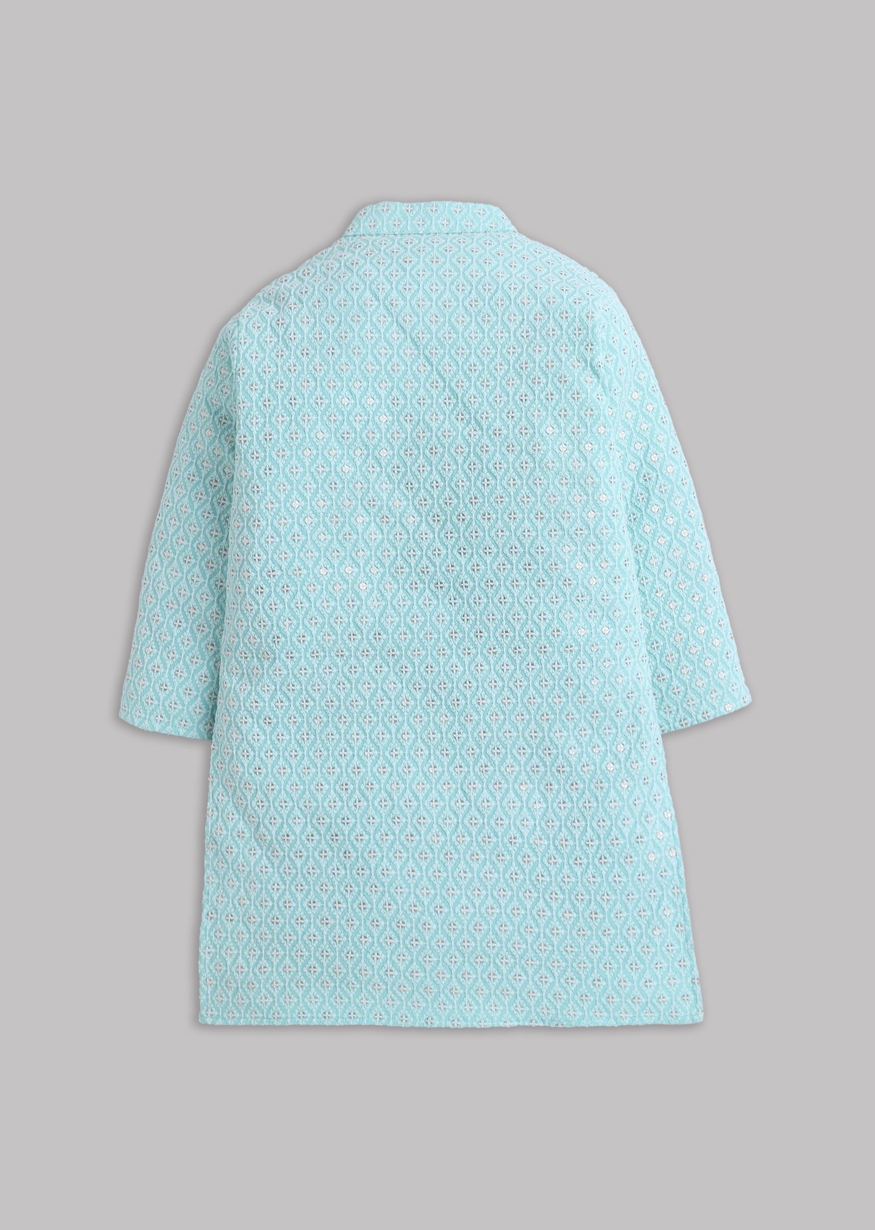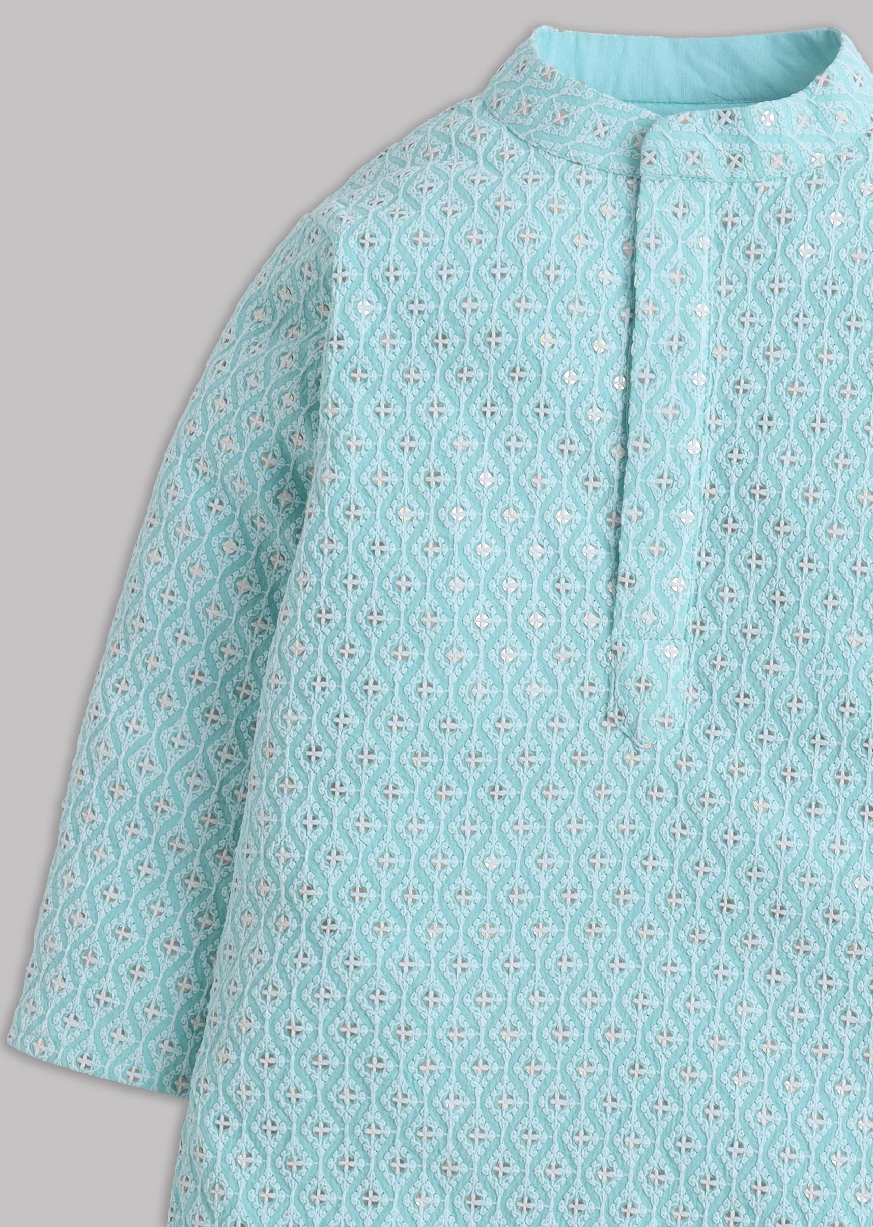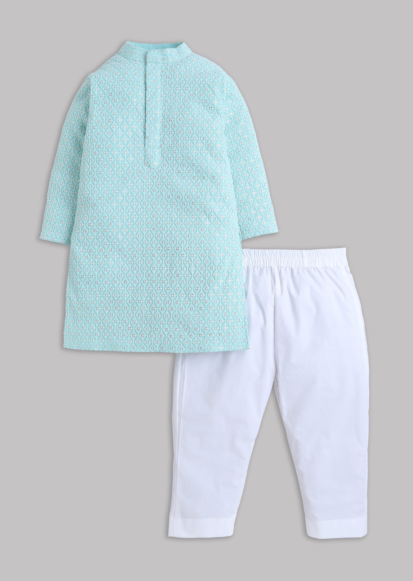 A festive blue cotton kurta with sequin and thread embroidery, paired with comfort-fit cotton lycra pants. Full sleeves and a mandarin collar keep it structured while staying kid-friendly comfortable. Awarded as the Most Trusted Brand, we're delivering styles you love, just as promised.