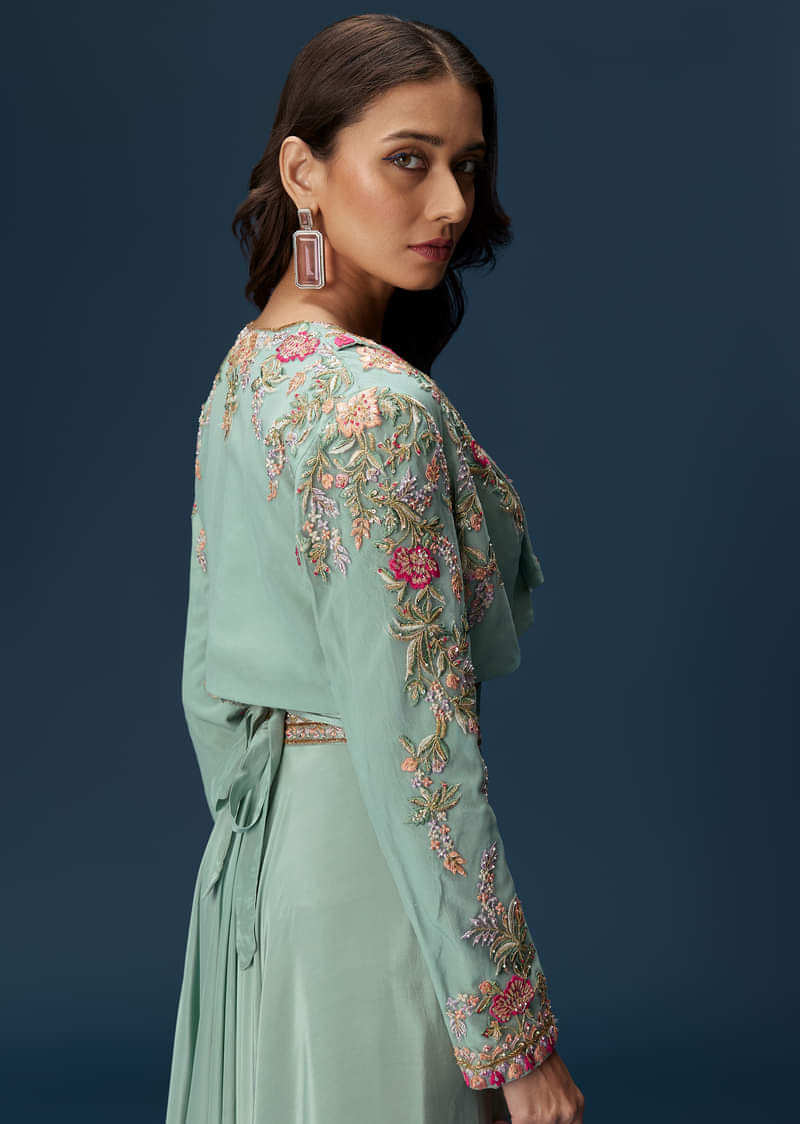 This pastel blue Indo-western palazzo set features an intricately embroidered blouse with a matching longline jacket and fluid palazzos. A graceful blend of modern silhouette and ethnic detailing, perfect for... More Product Details