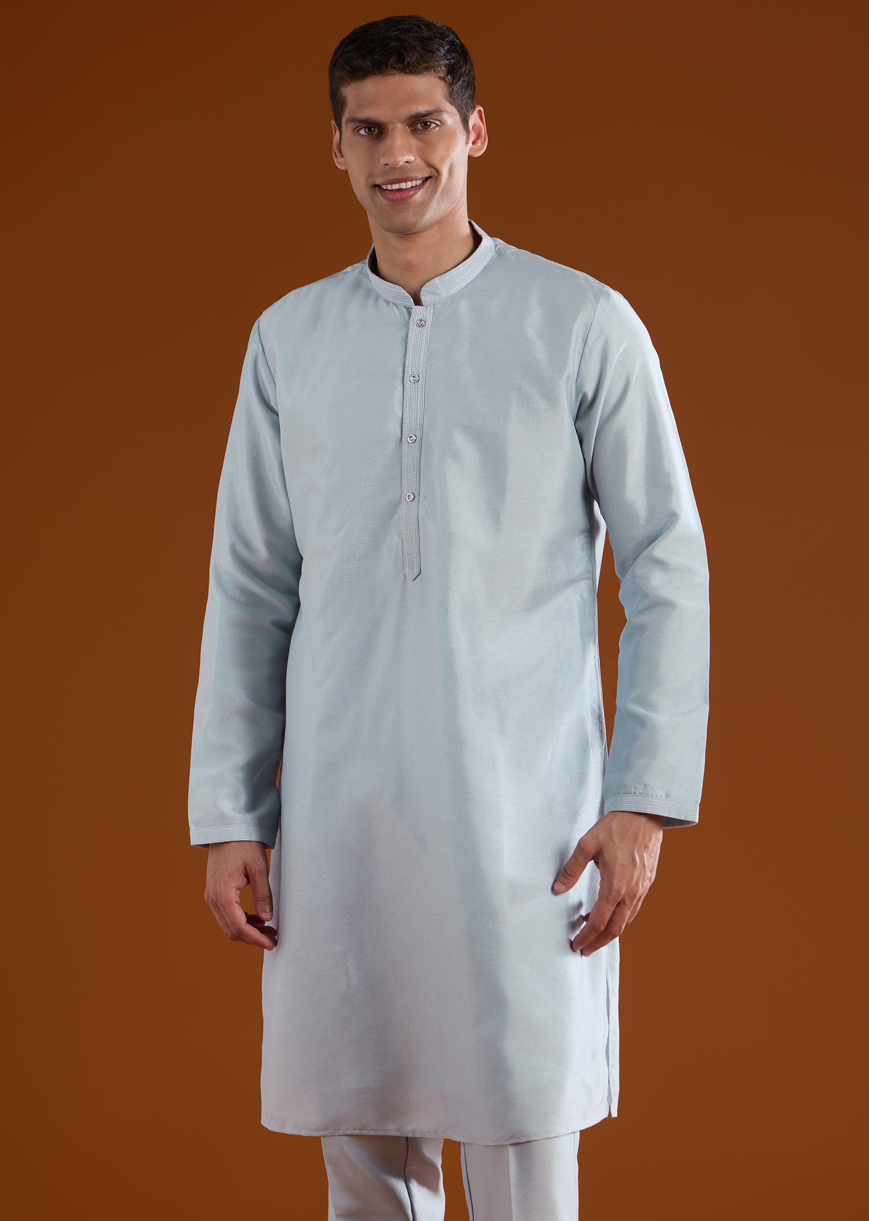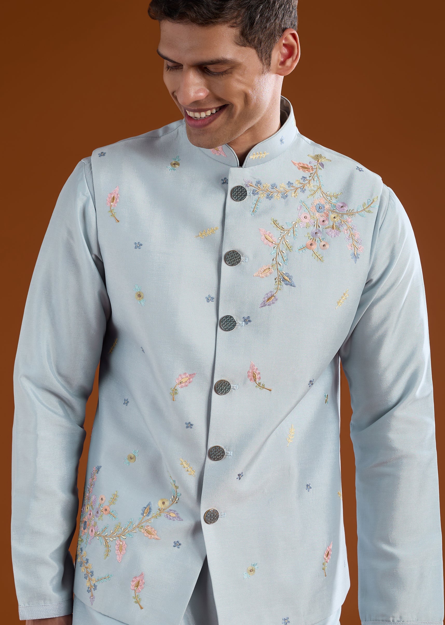 Classic and versatile, this blue kurta jacket set is crafted in smooth art silk for refined festive dressing. The kurta features a mandarin collar and full sleeves, paired with a jacket accented with delicate resham thread embroidery. Completed with straight-fit trousers and a partially elasticated waist, this ensemble suits festive gatherings and wedding events. Awarded as the Most Trusted Brand, we're delivering styles you love, just as promised.