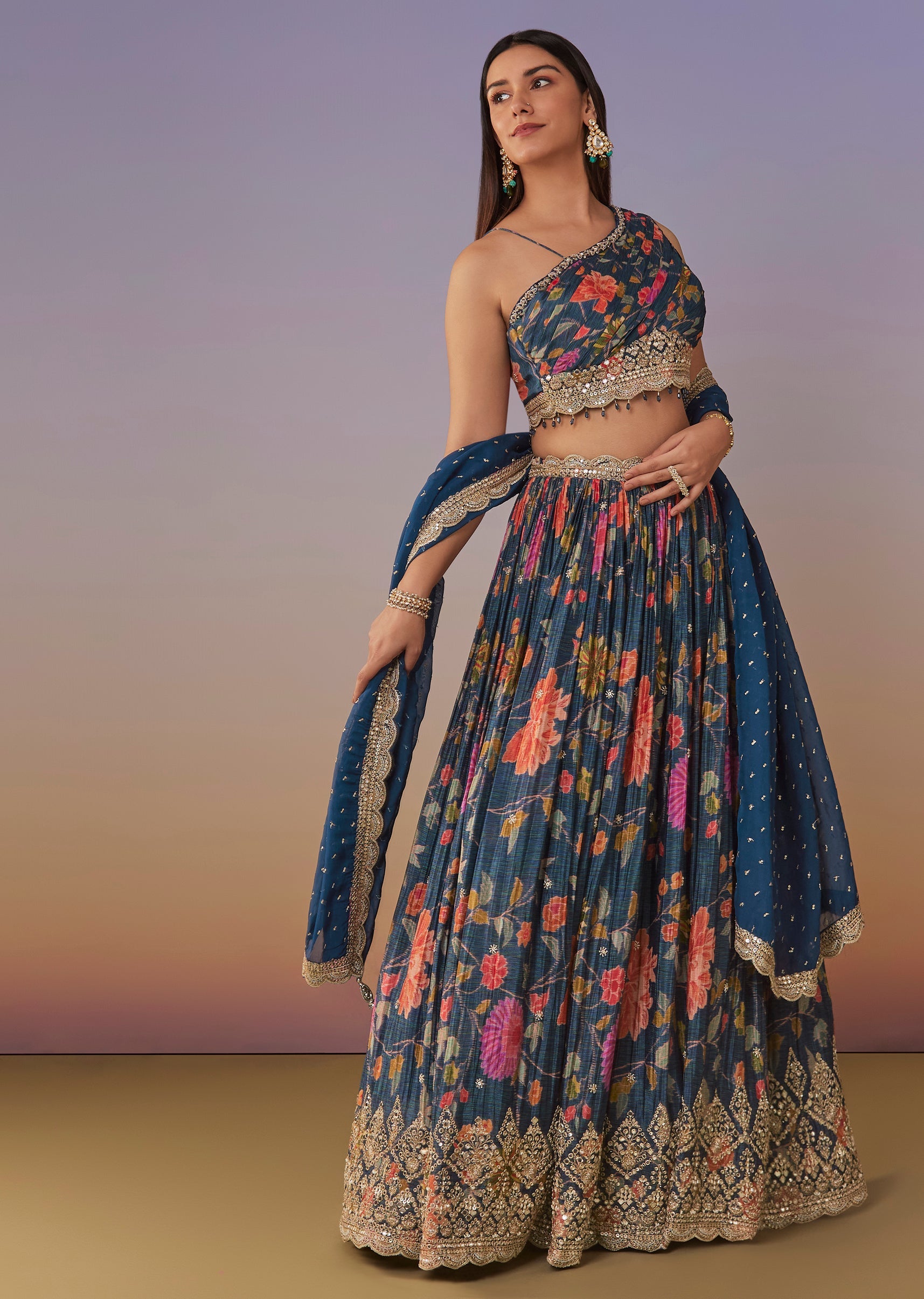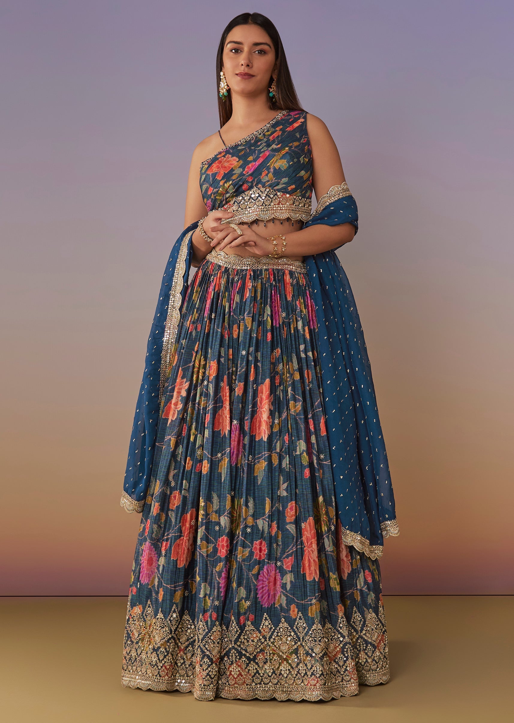 A playful blue floral printed lehenga set in chinon featuring a trendy one-shoulder choli with sequin work. The circular flared lehenga and matching dupatta create a fun, modern look—perfect for... More Product Details