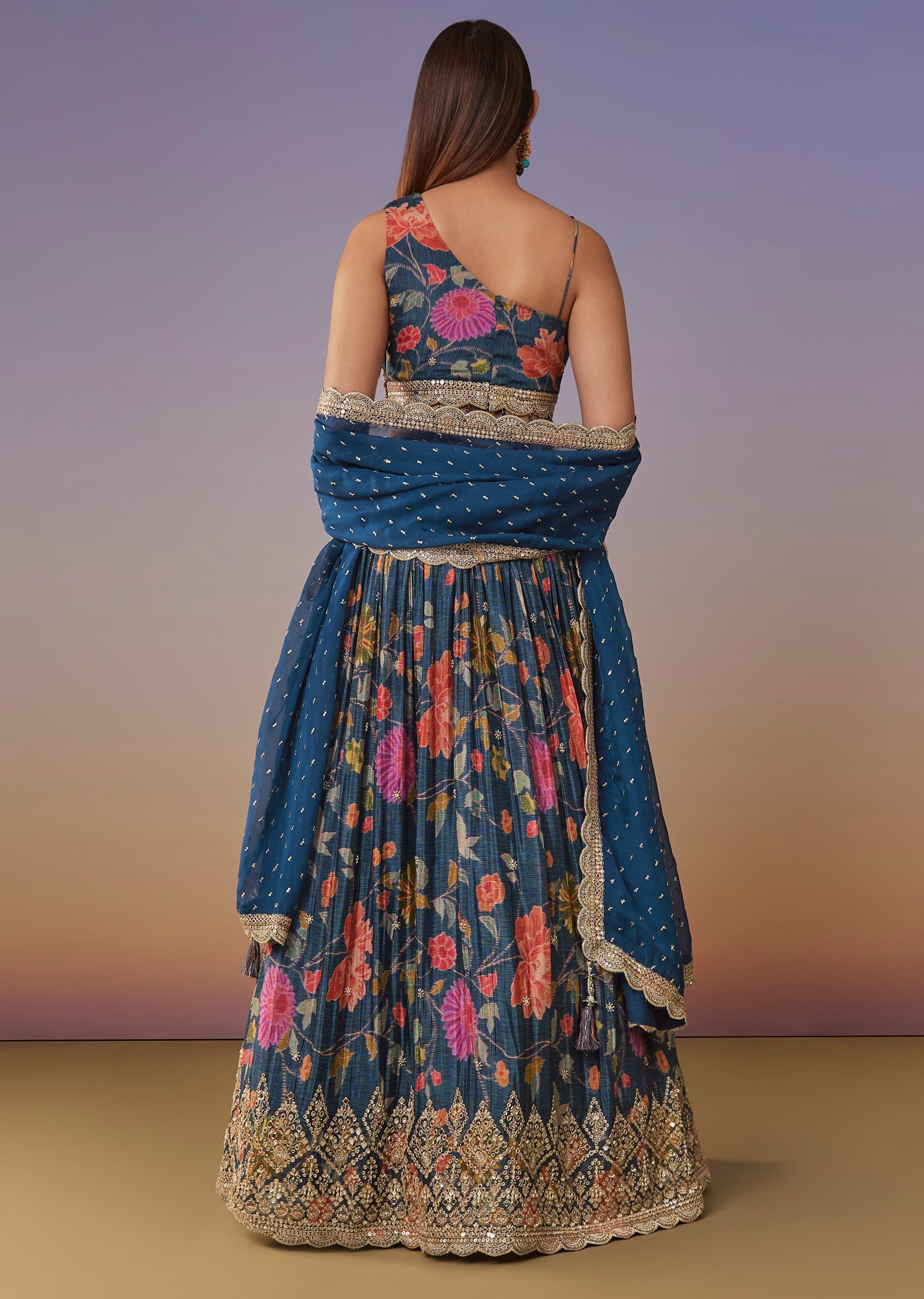 A playful blue floral printed lehenga set in chinon featuring a trendy one-shoulder choli with sequin work. The circular flared lehenga and matching dupatta create a fun, modern look—perfect for mehendi and sangeet functions. Awarded as the Most Trusted Brand, we're delivering styles you love, just as promised.