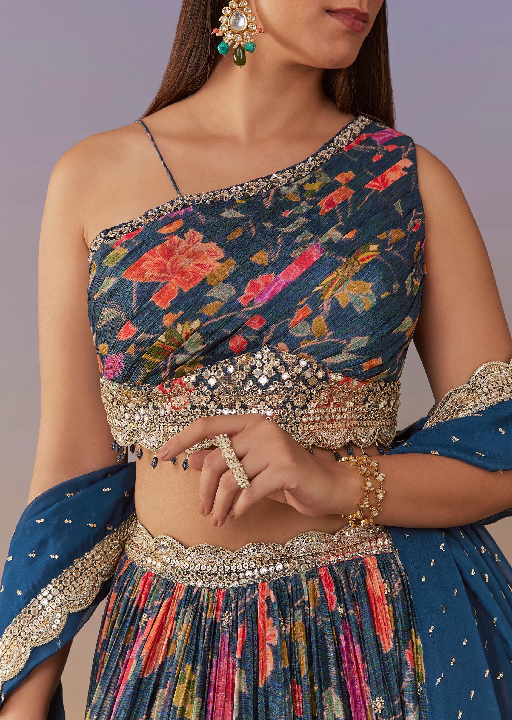 Blue Floral One Shoulder Lehenga Set With Sequin Detailing