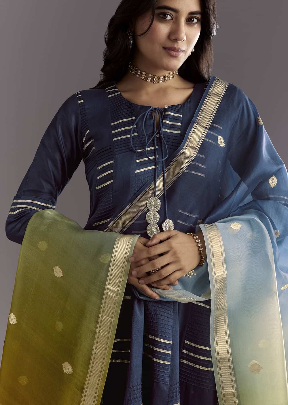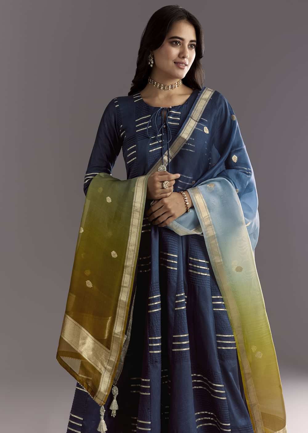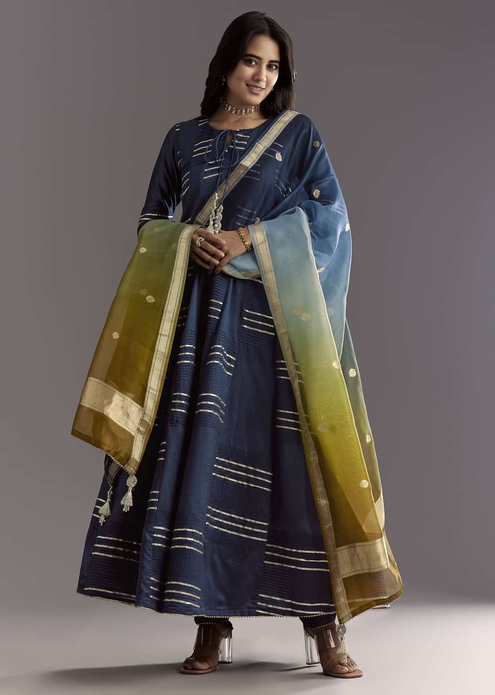 Dreamy like the dusk sky, this blue chanderi anarkali flows with gotta work and an ombre organza dupatta dotted in zari butti—crafted for rituals and reverence.Standard Lenght of Anarkali is... More Product Details