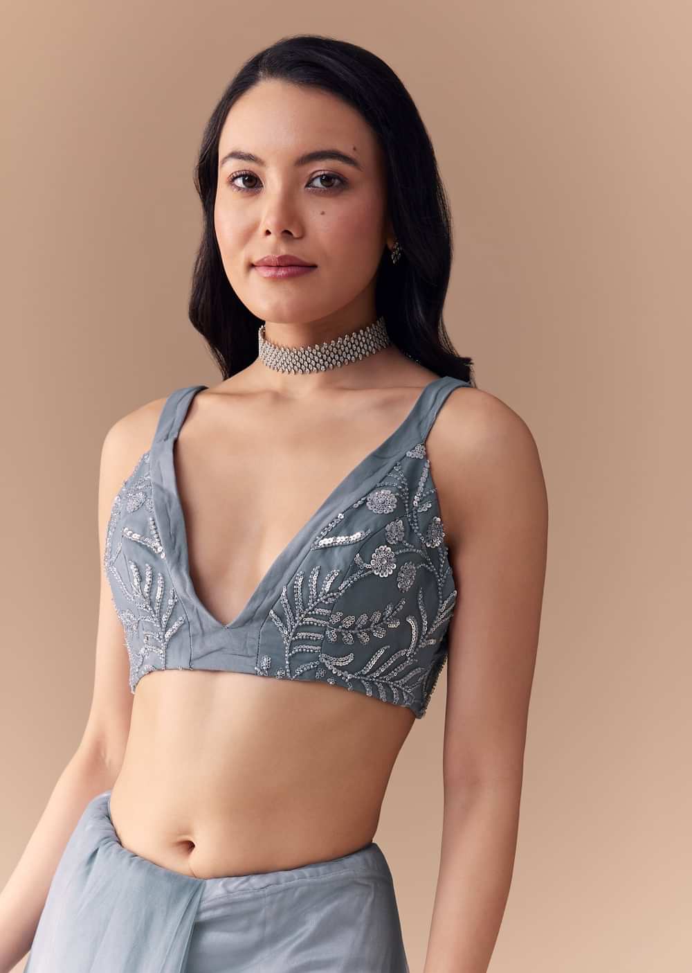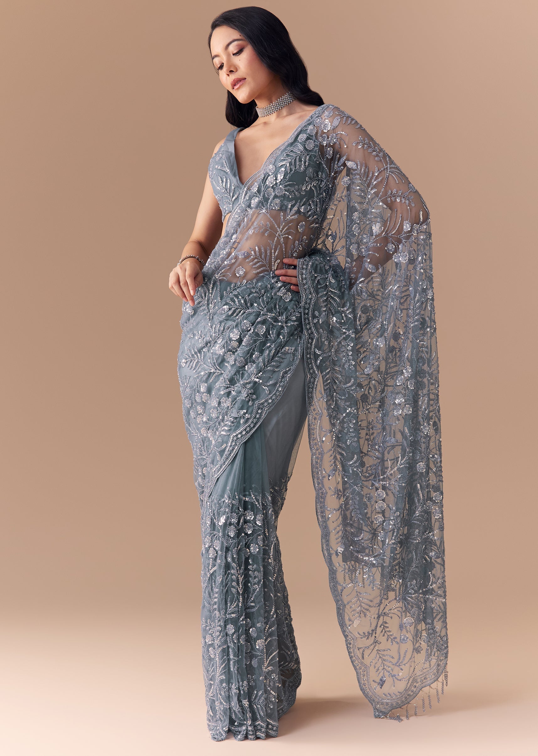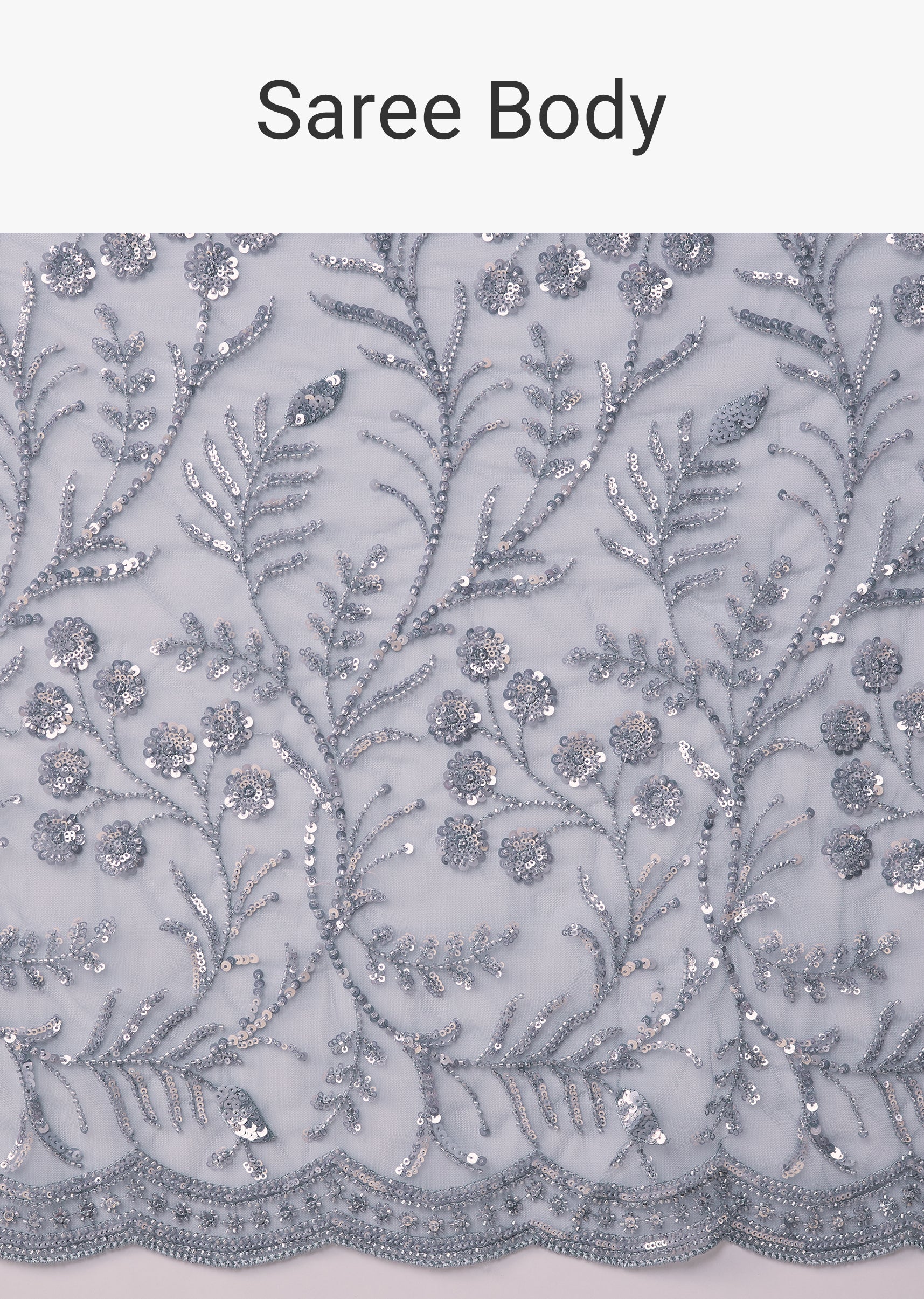 Blue Grey Net Sequin Floral Work Saree with Unstitched Blouse