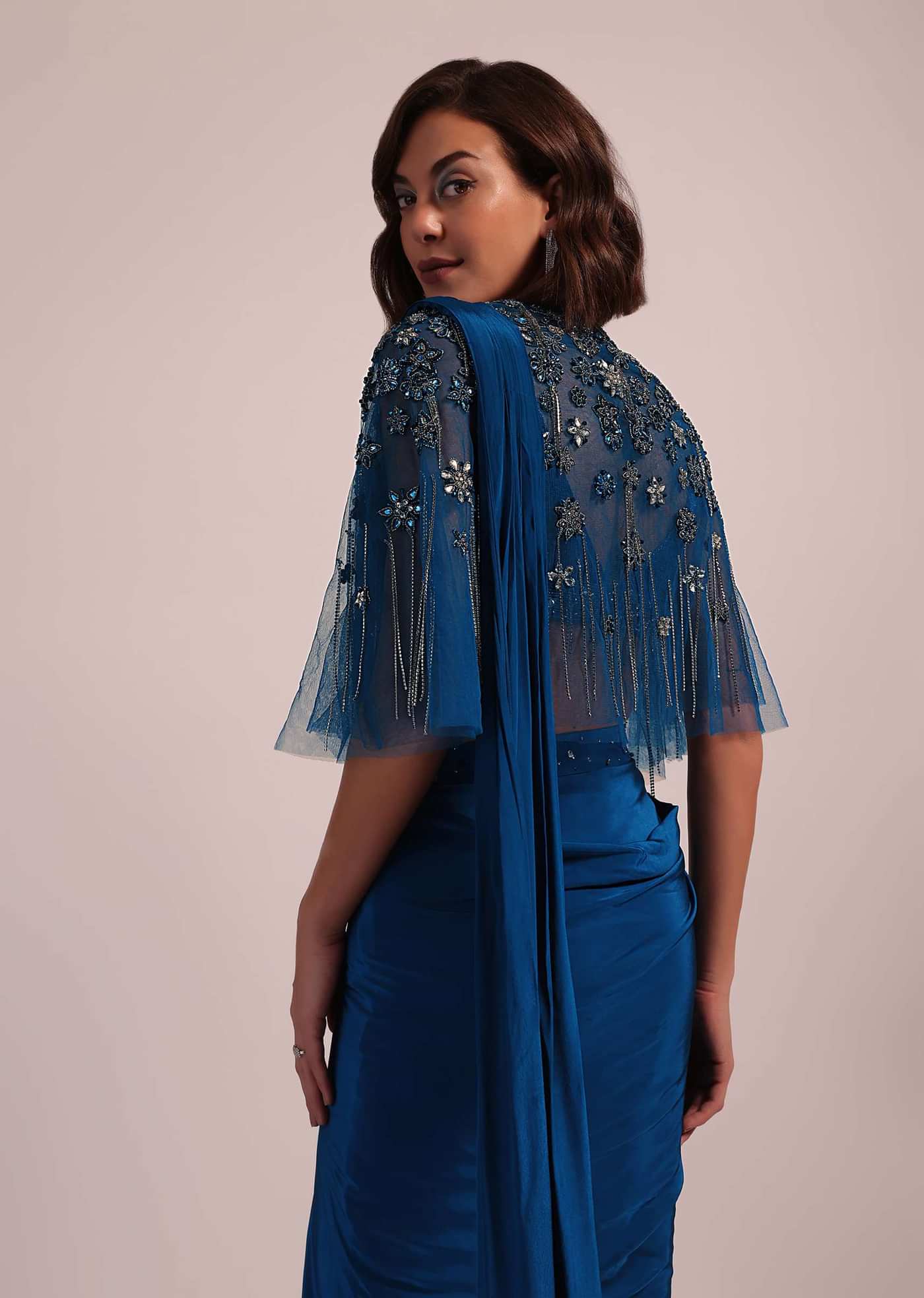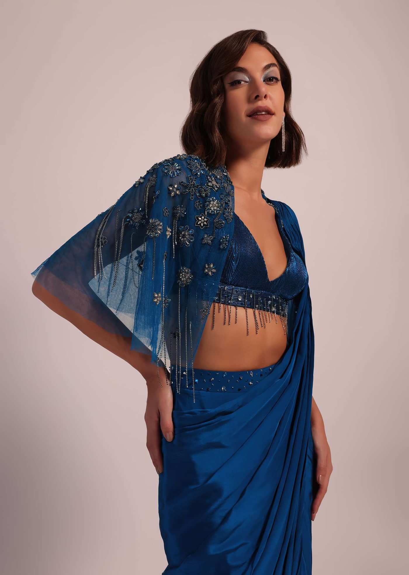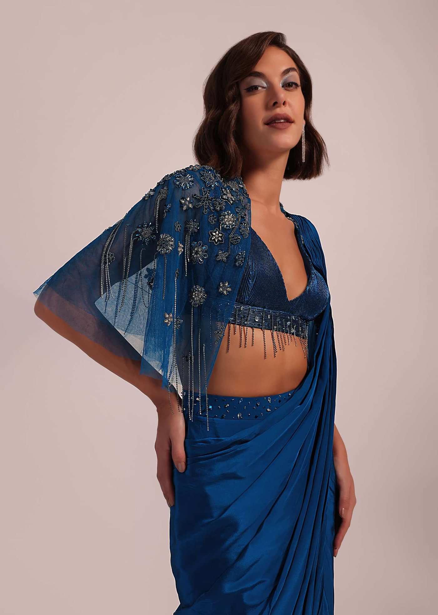 Blue Hand Embroidered Ready Pleated Saree And Blouse In Crepe