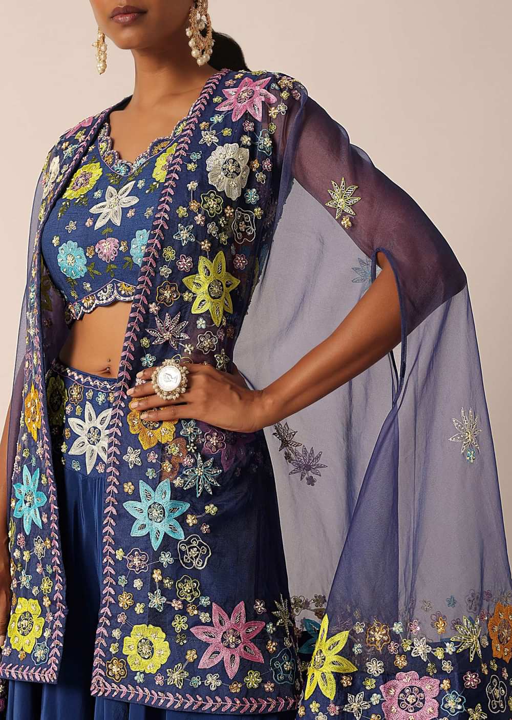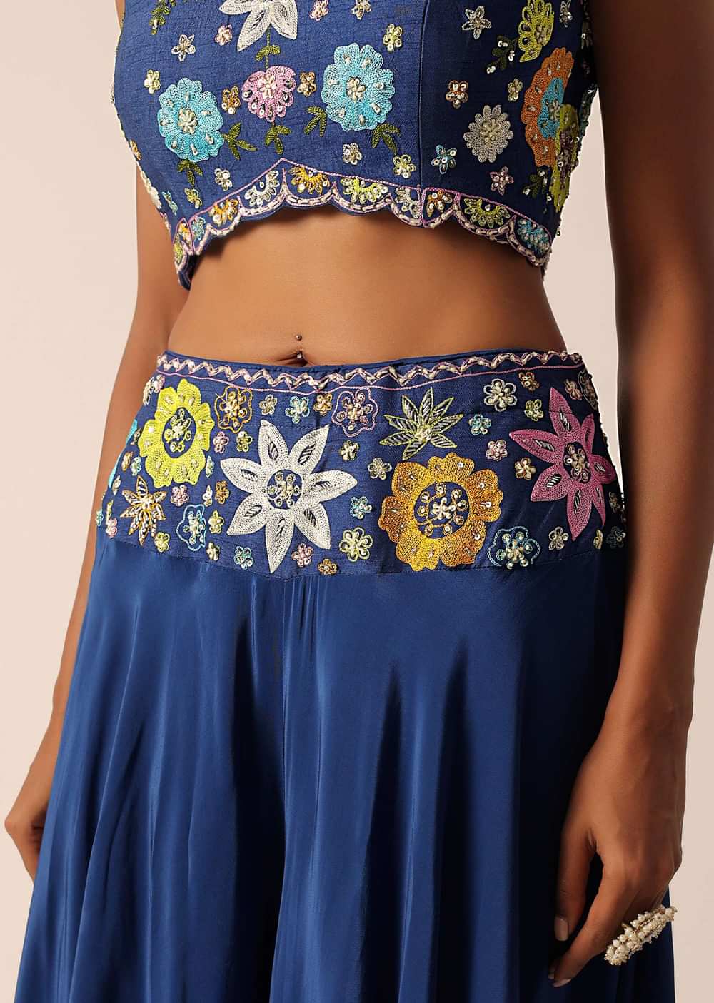 Blue Jacket And Palazzo Set With Floral Motif Embroidery