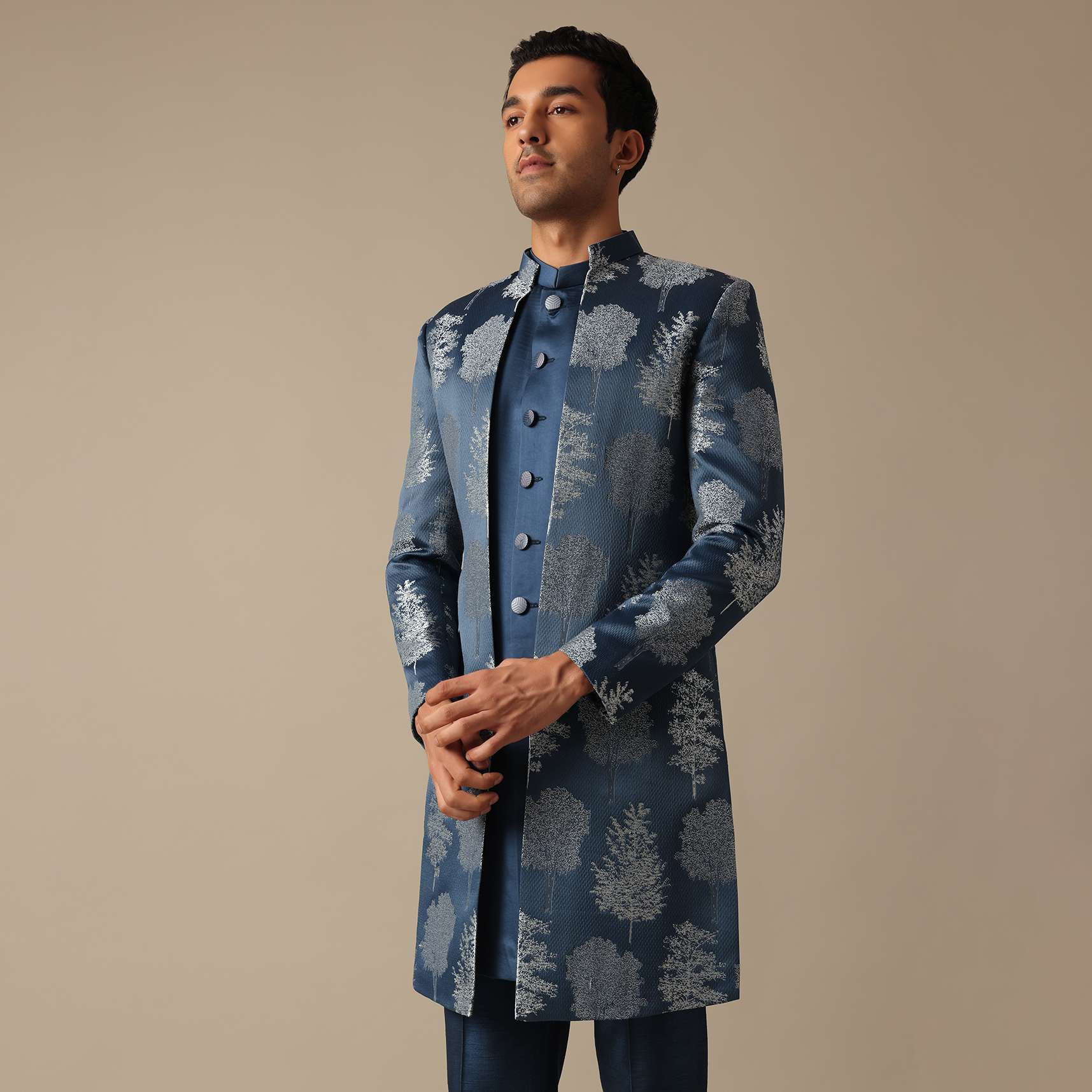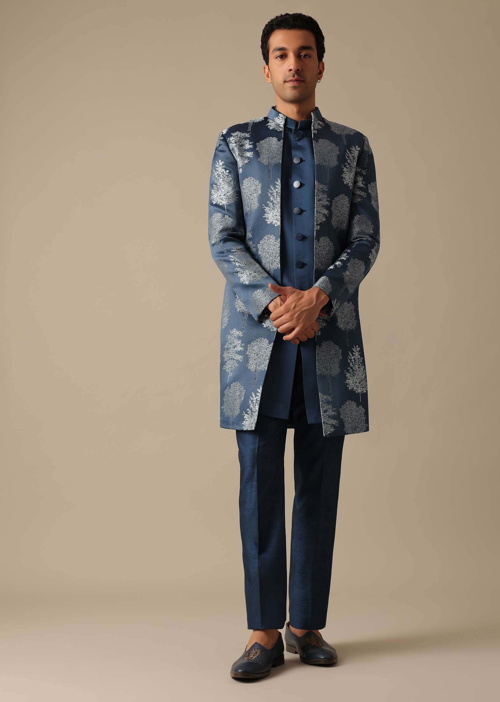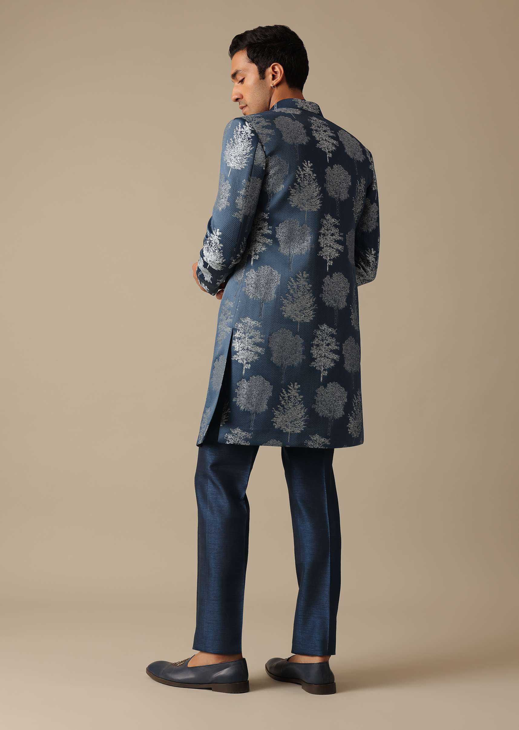 Blue Jacquard Foil Print Indowestern Achkan And Jacket Set