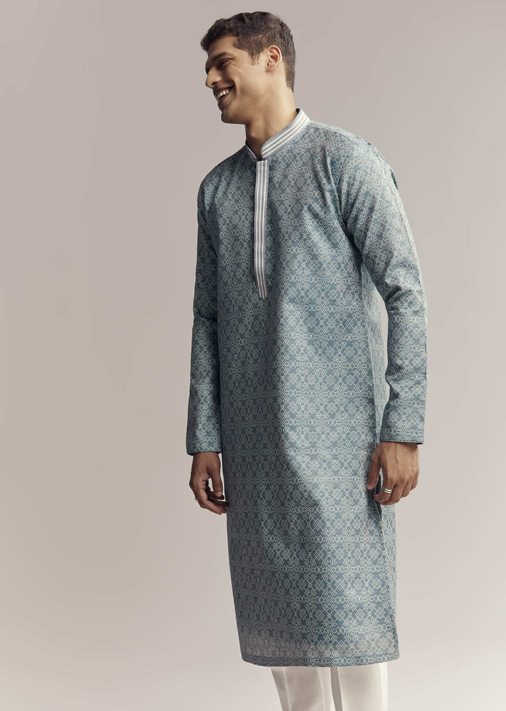 Rich blue jacquard makes this kurta set for men stand out with woven detail that catches the eye up close. It is understated but polished, perfect for a clean festive... More Product Details