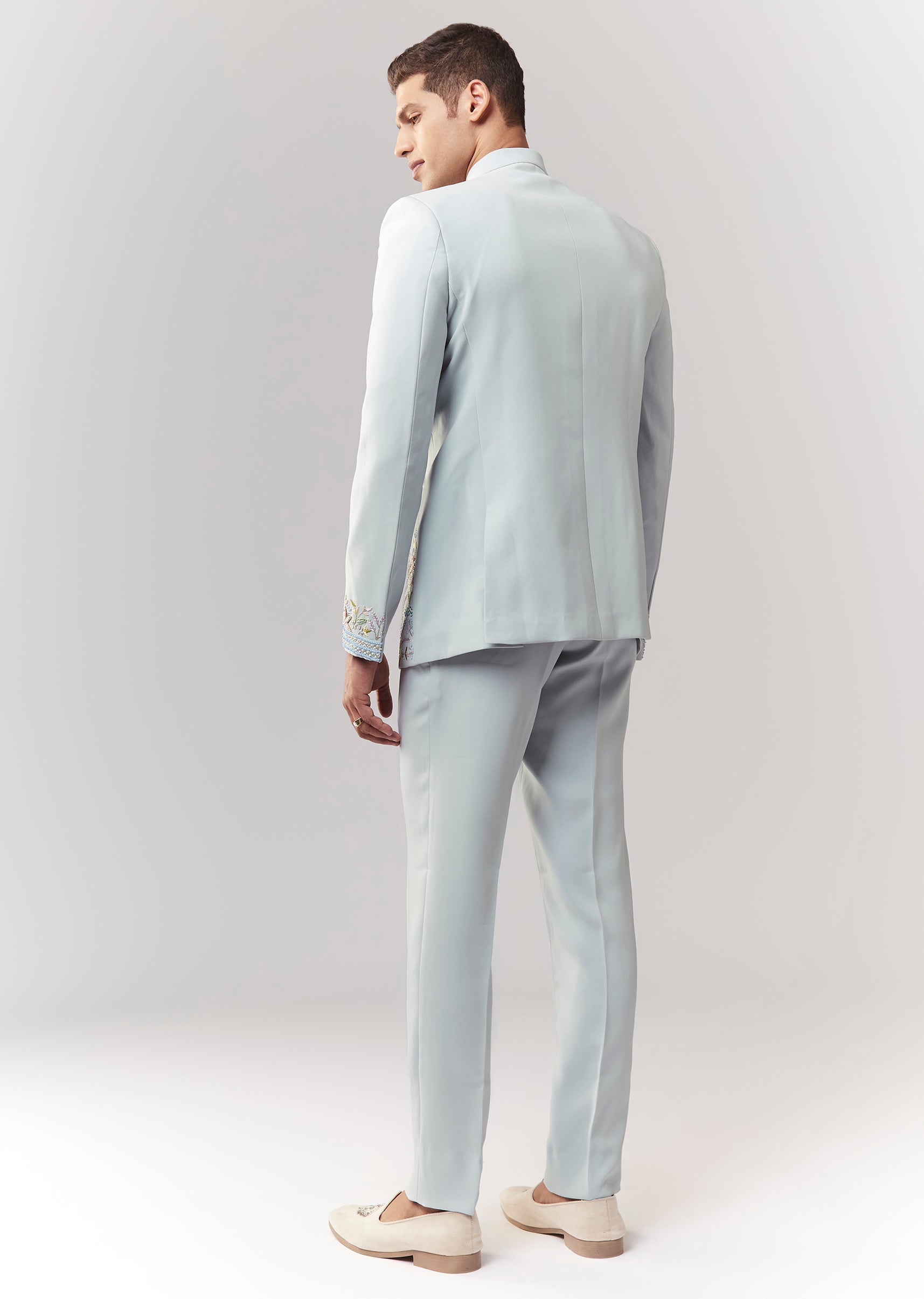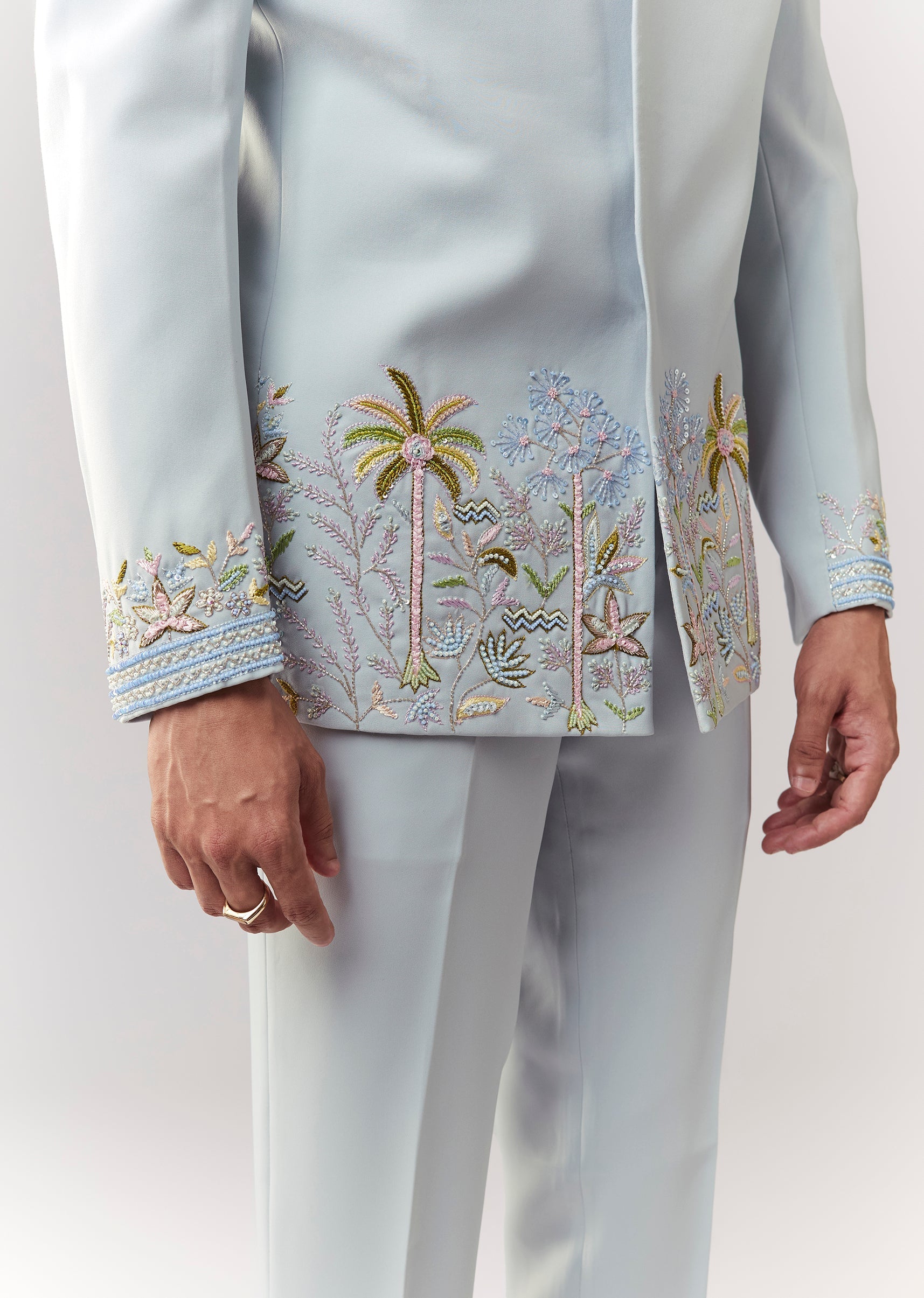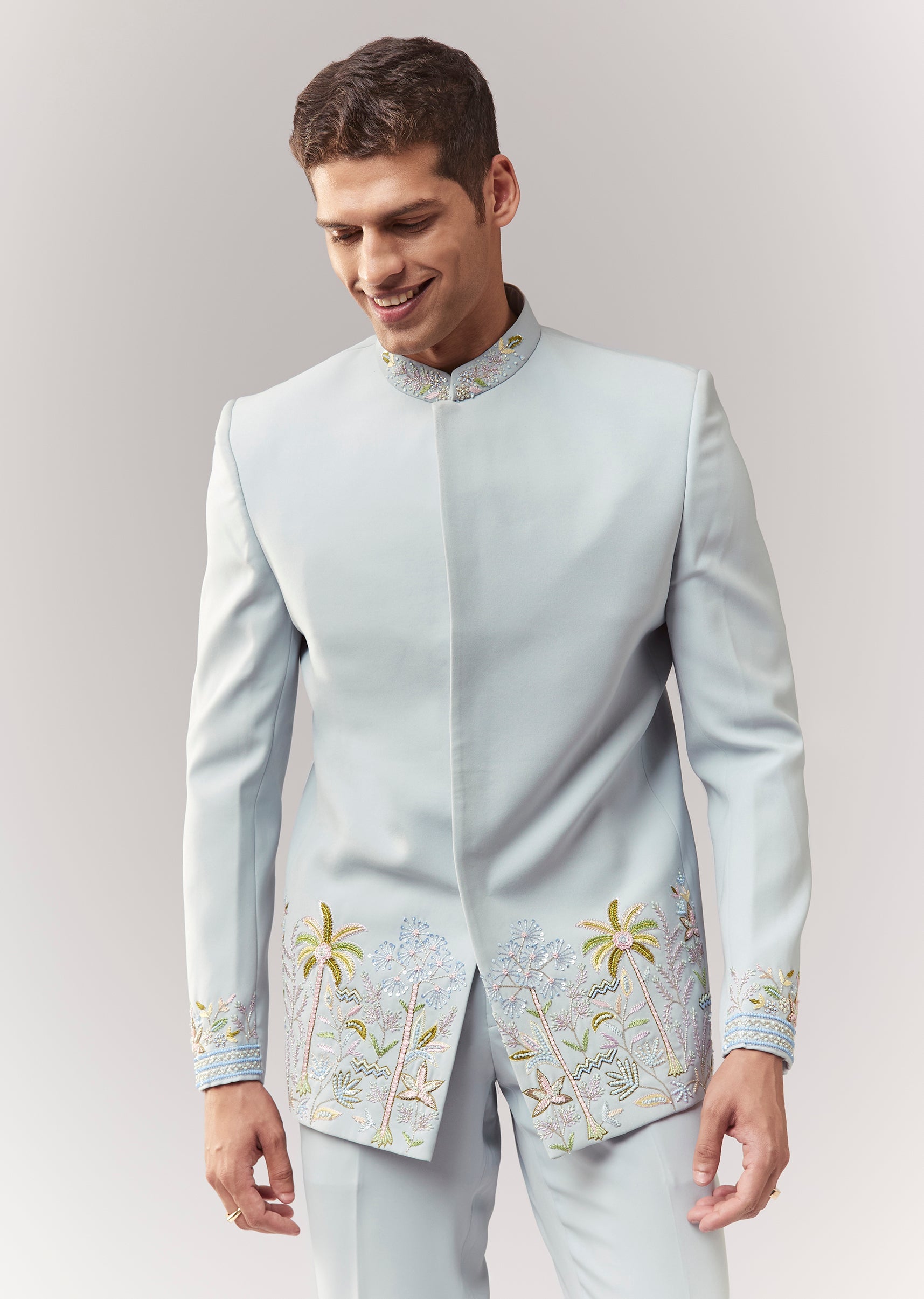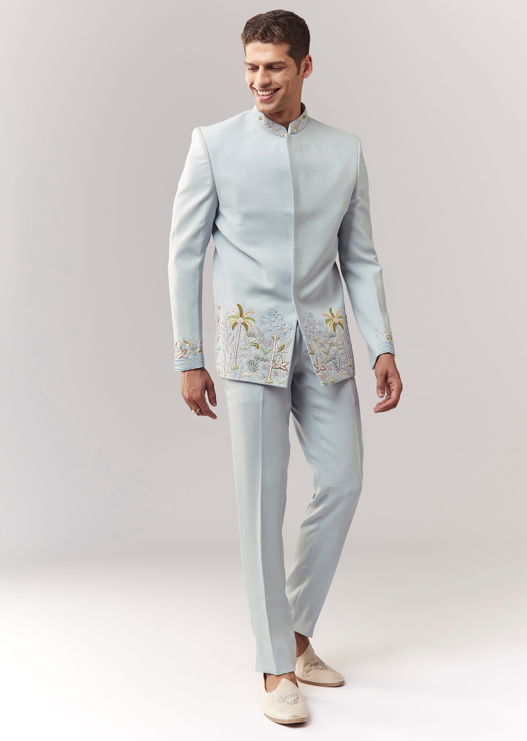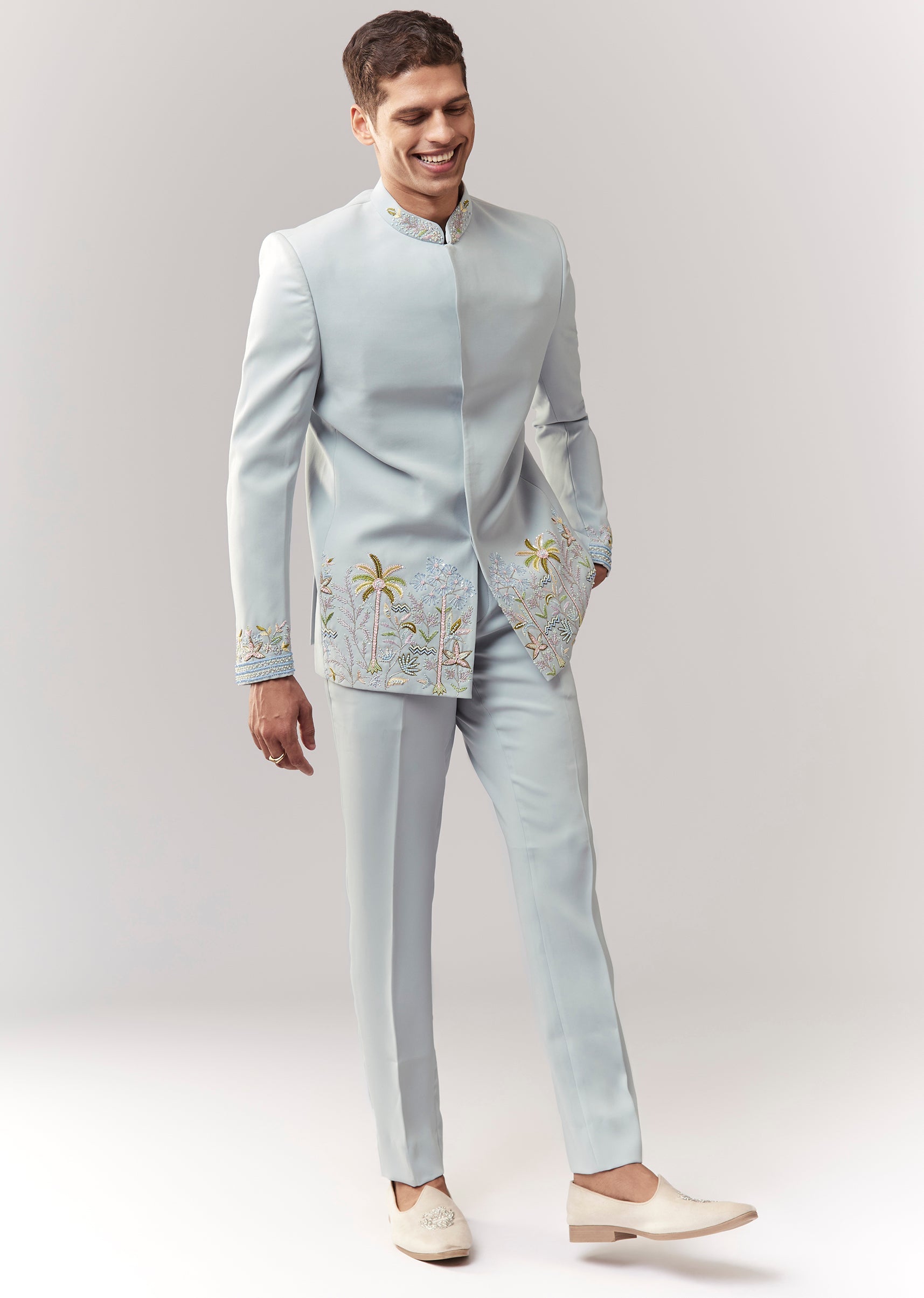 A festive blue jodhpuri in suiting fabric with cutdana, sequins, and thread/resham detailing. Mandarin collar, full sleeves, with front hook-eye closure. Paired with straight pants (mid-waist) for a structured groomsman... More Product Details