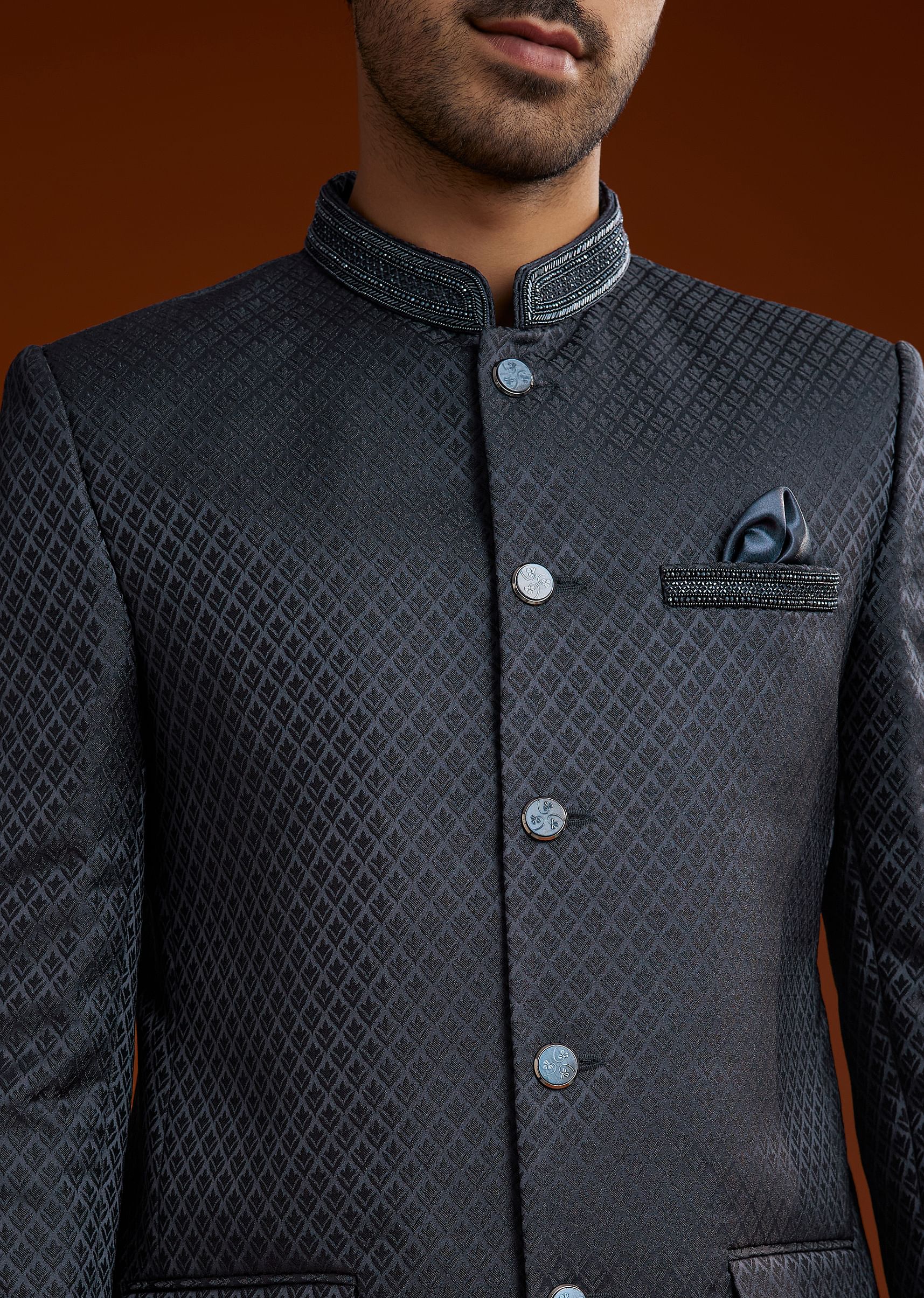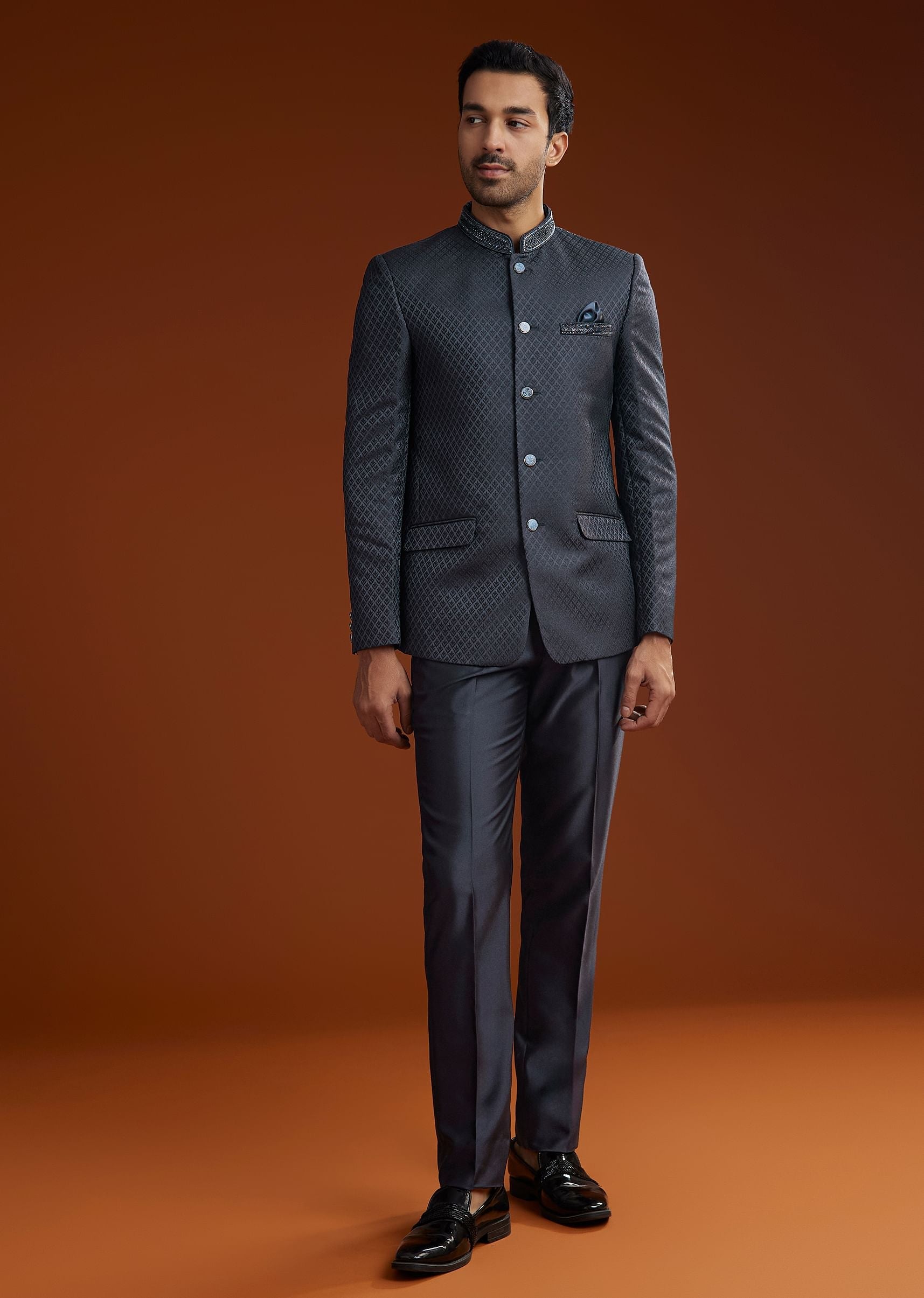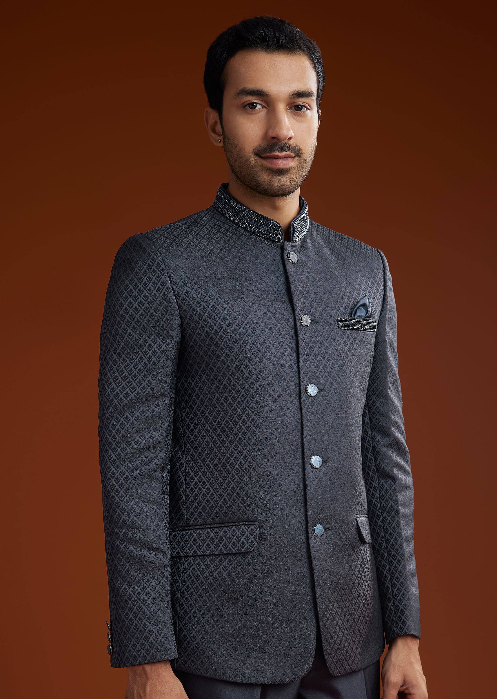 A symbol of royal elegance this blue polyviscose Jodhpuri suit is adorned with cut dana pott and damru embroidery. Designed with a Mandarin collar full sleeves and front button closure it is a refined choice for formal occasions.Awarded as the Most Trusted Brand we're delivering styles you love just as promised.