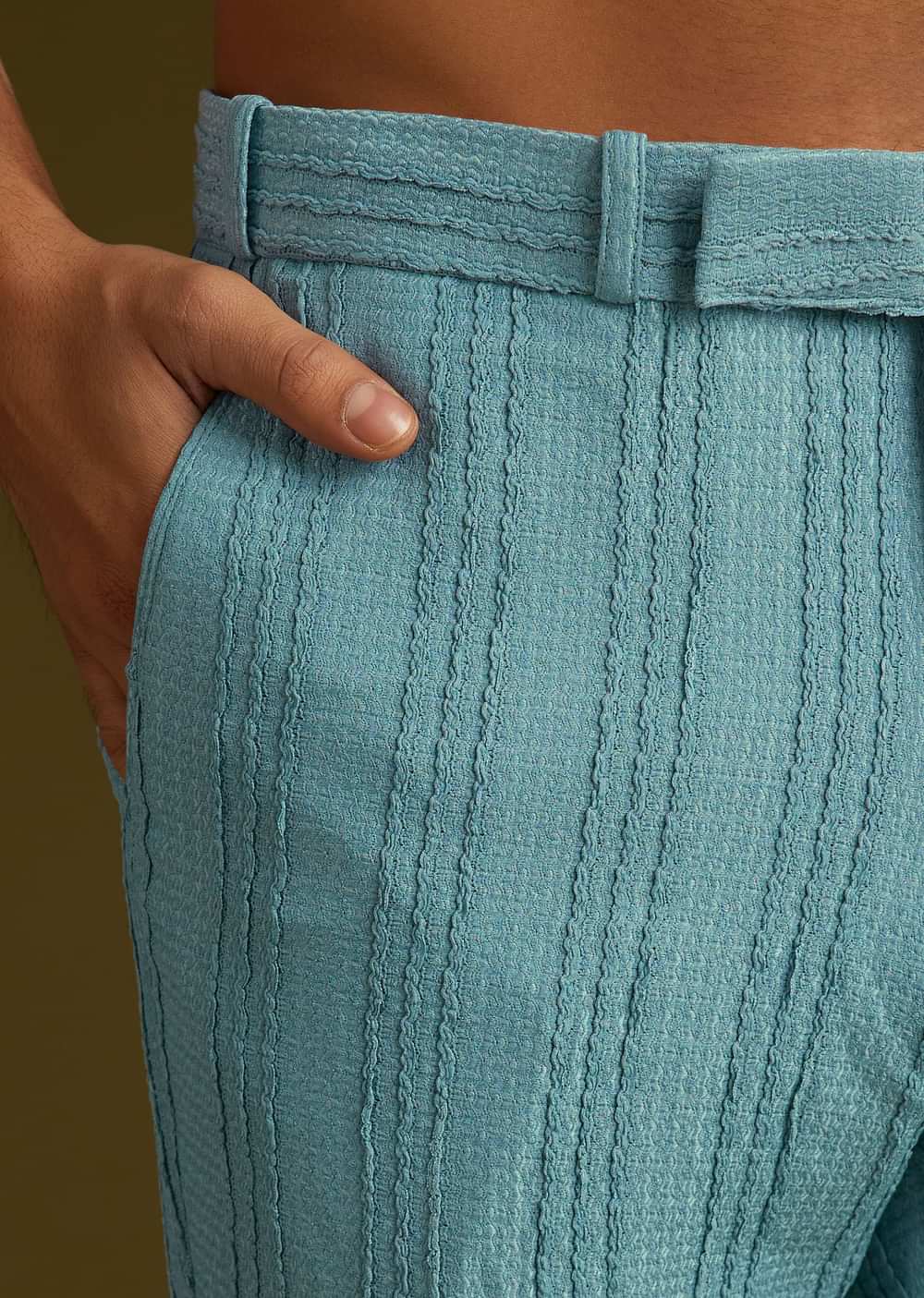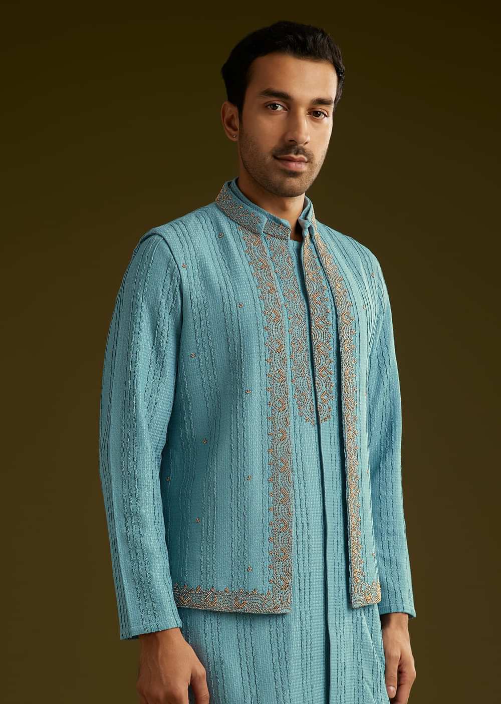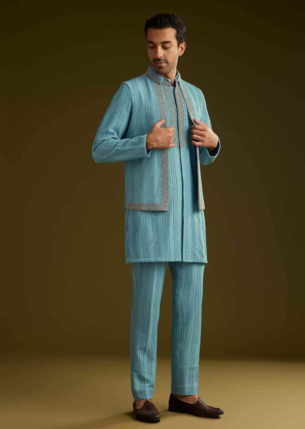 A sophisticated blue knit kurta jacket set adorned with moti and stone embellishments. The mandarin collar and full sleeves add to its opulent aesthetic..Awarded As The Most Trusted Brand We'Re Delivering Styles You Love Just As Promised.