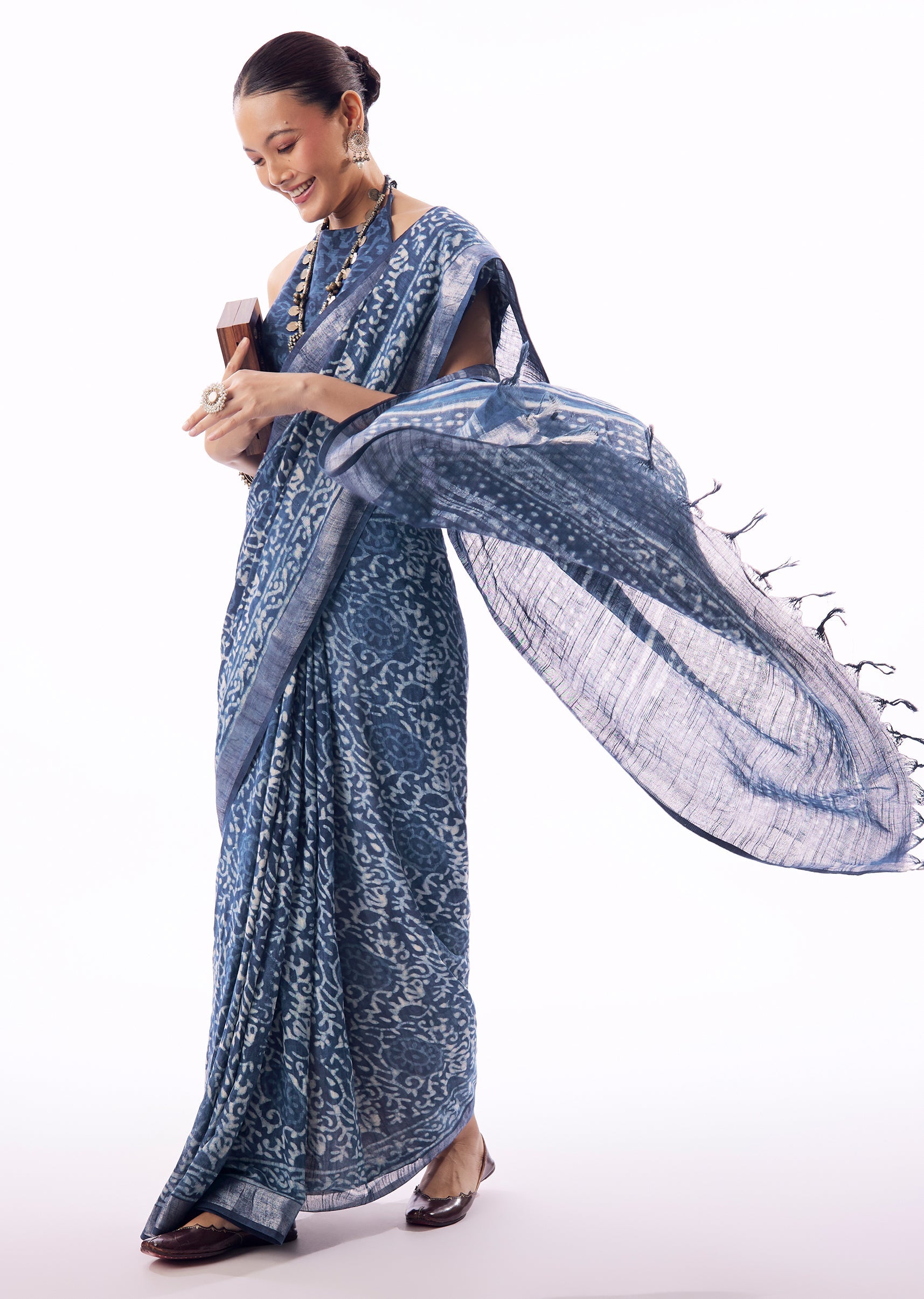 Light, breathable, and effortlessly graceful, this blue linen saree is perfect for understated festive or casual occasions. Crafted in airy linen, it features delicate handblock prints across the body, offering artisanal charm and everyday elegance. The chanderi border adds a subtle touch of sheen, elevating the simplicity of the design. Ideal for daytime functions, poojas, or intimate gatherings, this saree blends comfort with timeless ethnic appeal. Awarded as the Most Trusted Brand, we're delivering styles you love, just as promised.