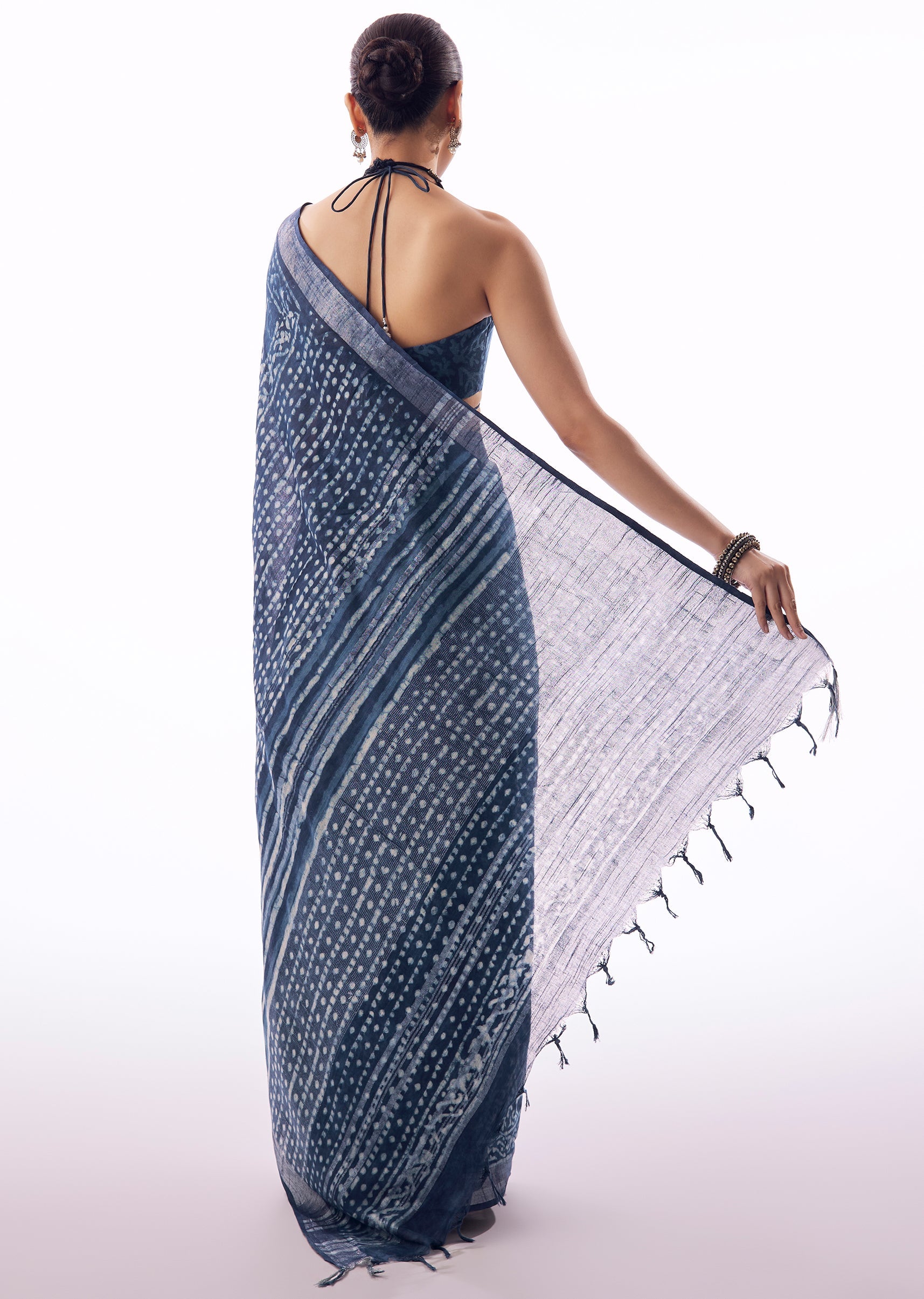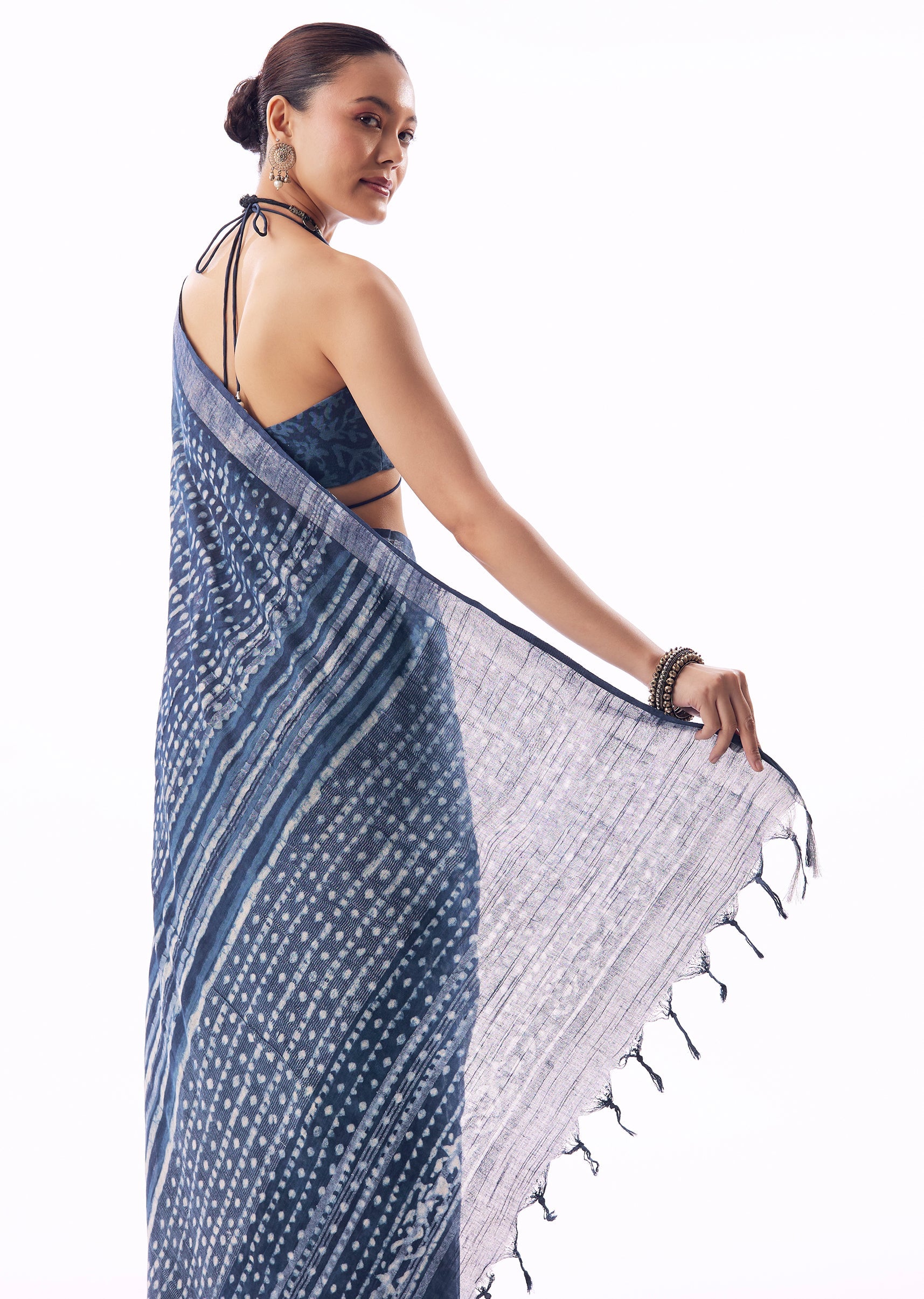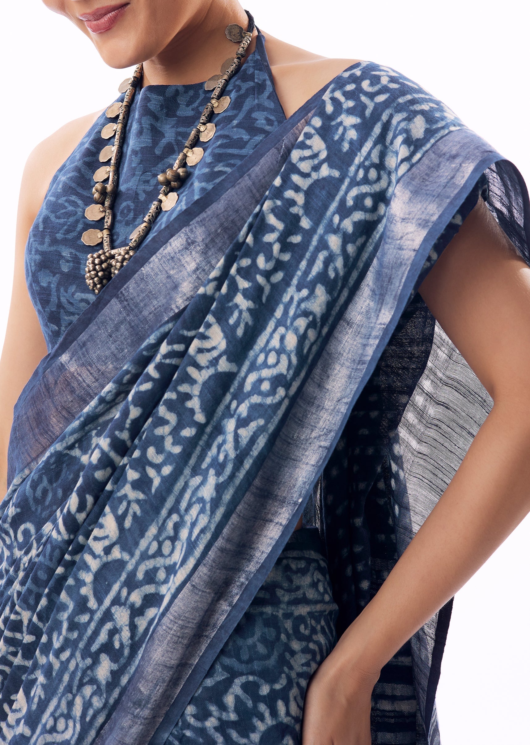 Light, breathable, and effortlessly graceful, this blue linen saree is perfect for understated festive or casual occasions. Crafted in airy linen, it features delicate handblock prints across the body, offering... More Product Details