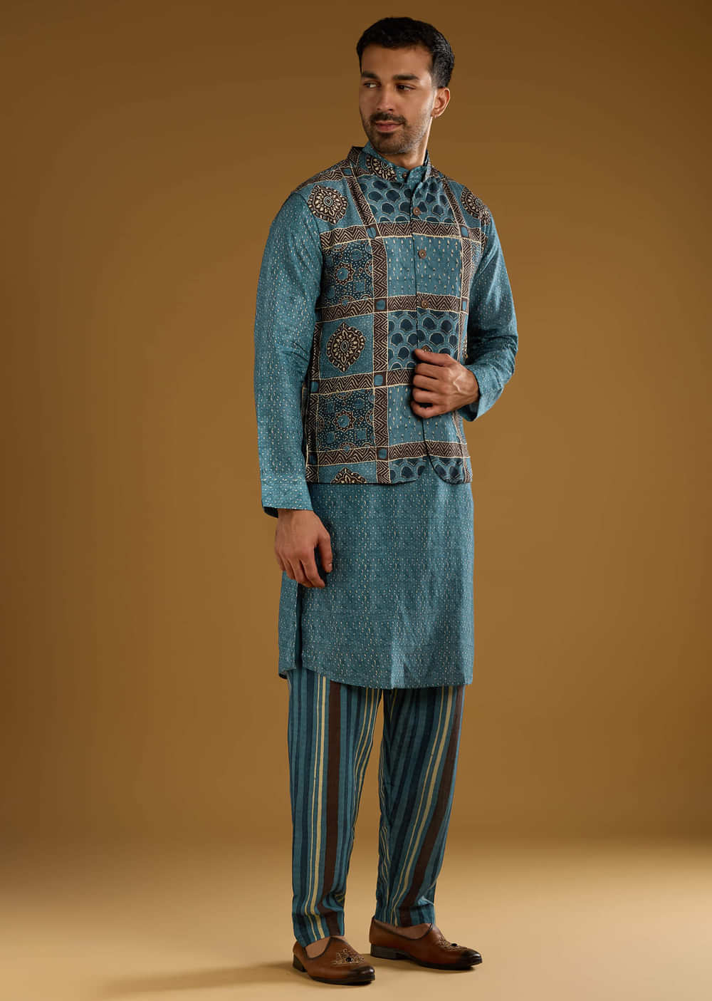 Blue Linen Kurta Jacket Set For Men With Hand Block Ajrakh Print
