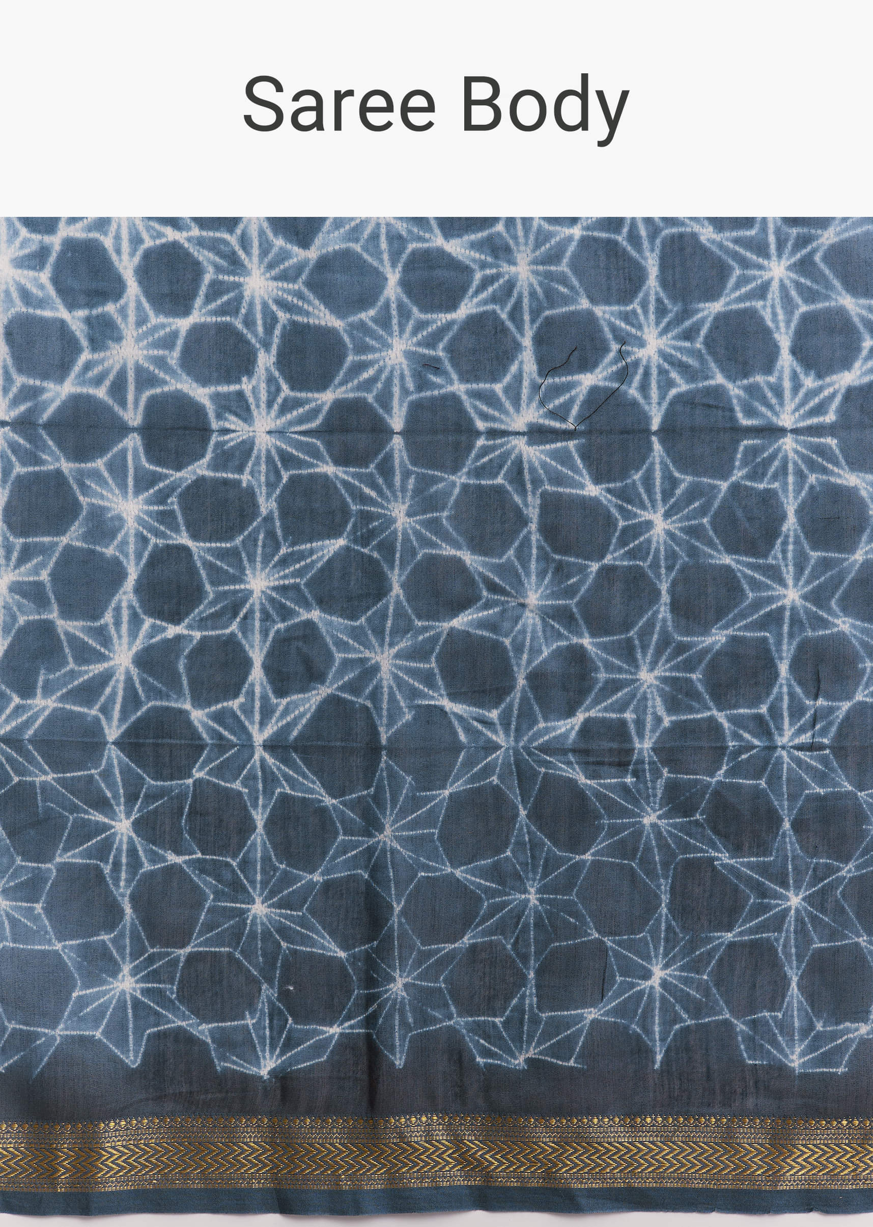 This blue linen saree is hand dyed using Shibori techniques, with geometric block prints layered across the body. A copper gold zari woven border brings a subtle shimmer to this... More Product Details