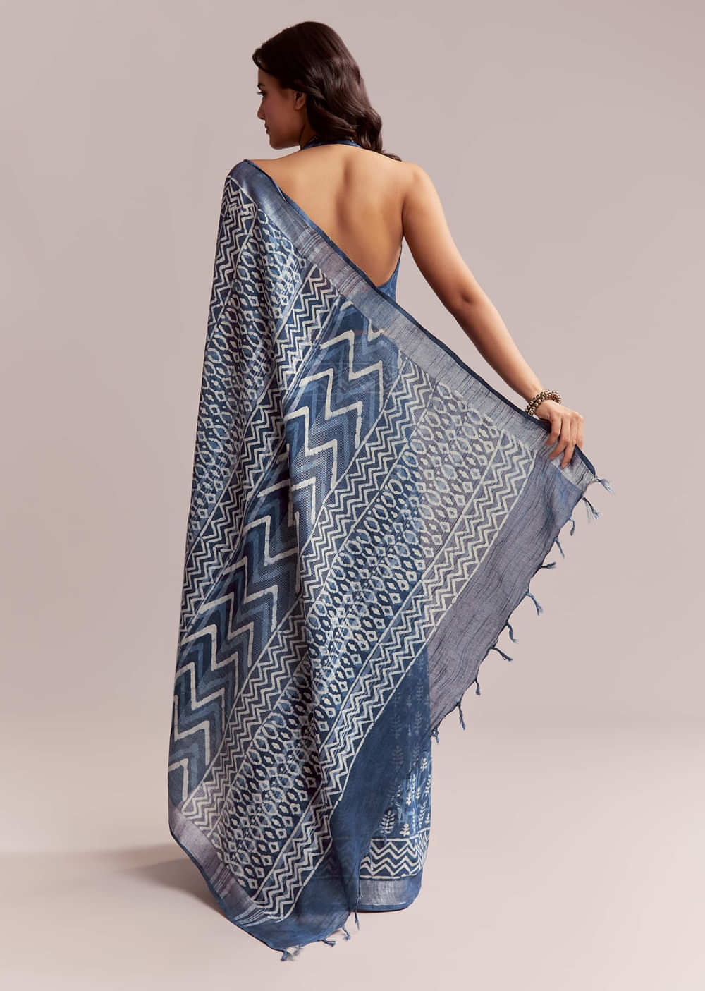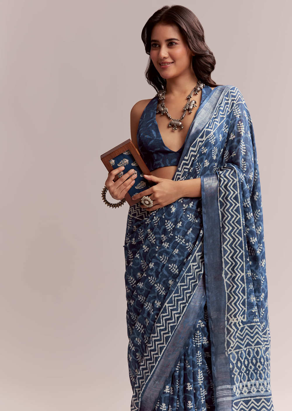 Blue Linen Printed Saree With Heritage Ajrakh Leaf Print