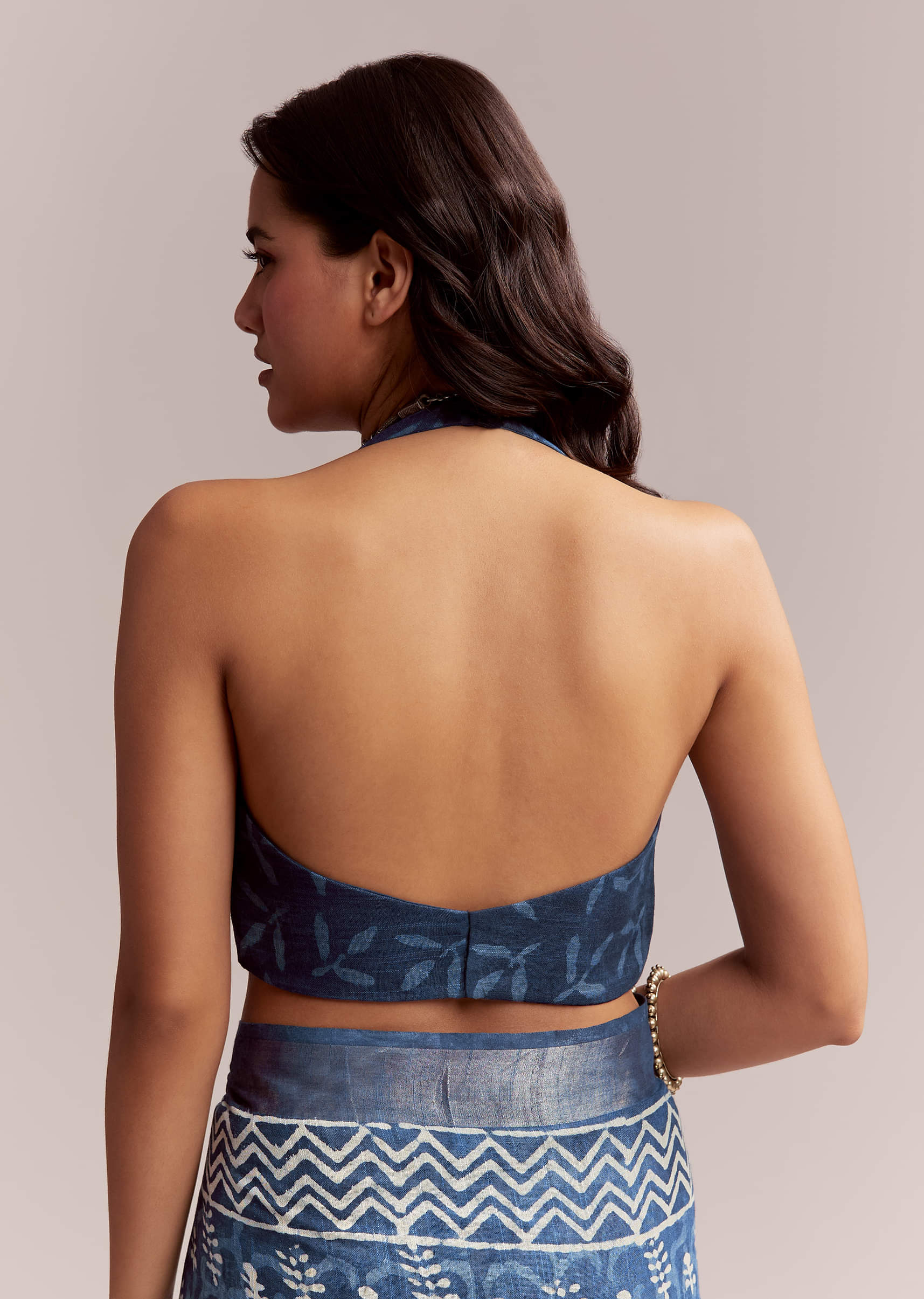 This blue linen saree features all-over double Ajrakh printing with leafy motifs and a zigzag design on the border and pallu. The Chanderi border adds light texture to this heritage-inspired... More Product Details