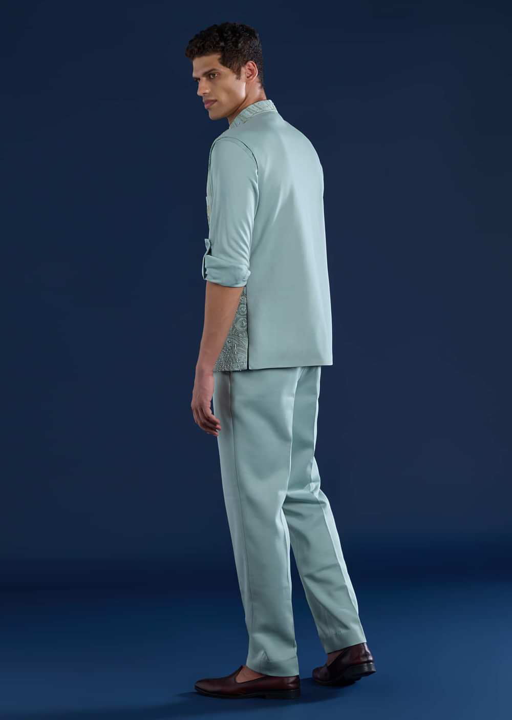 Blue Mens Cutdana Work Jacket Kurta and Pant Set