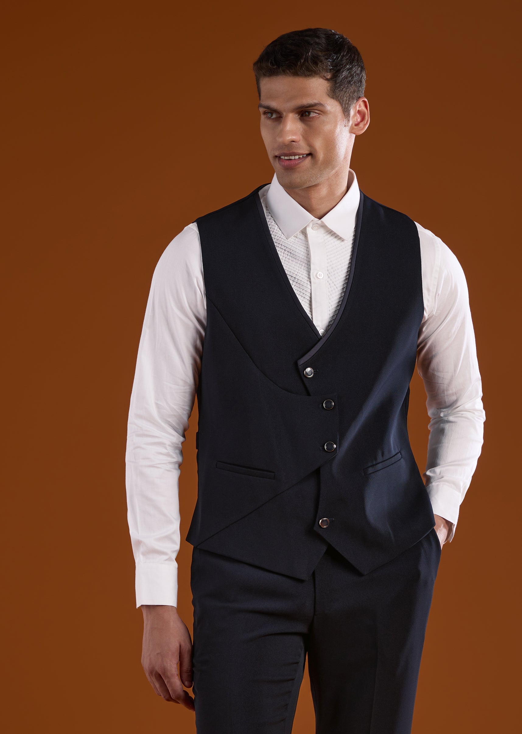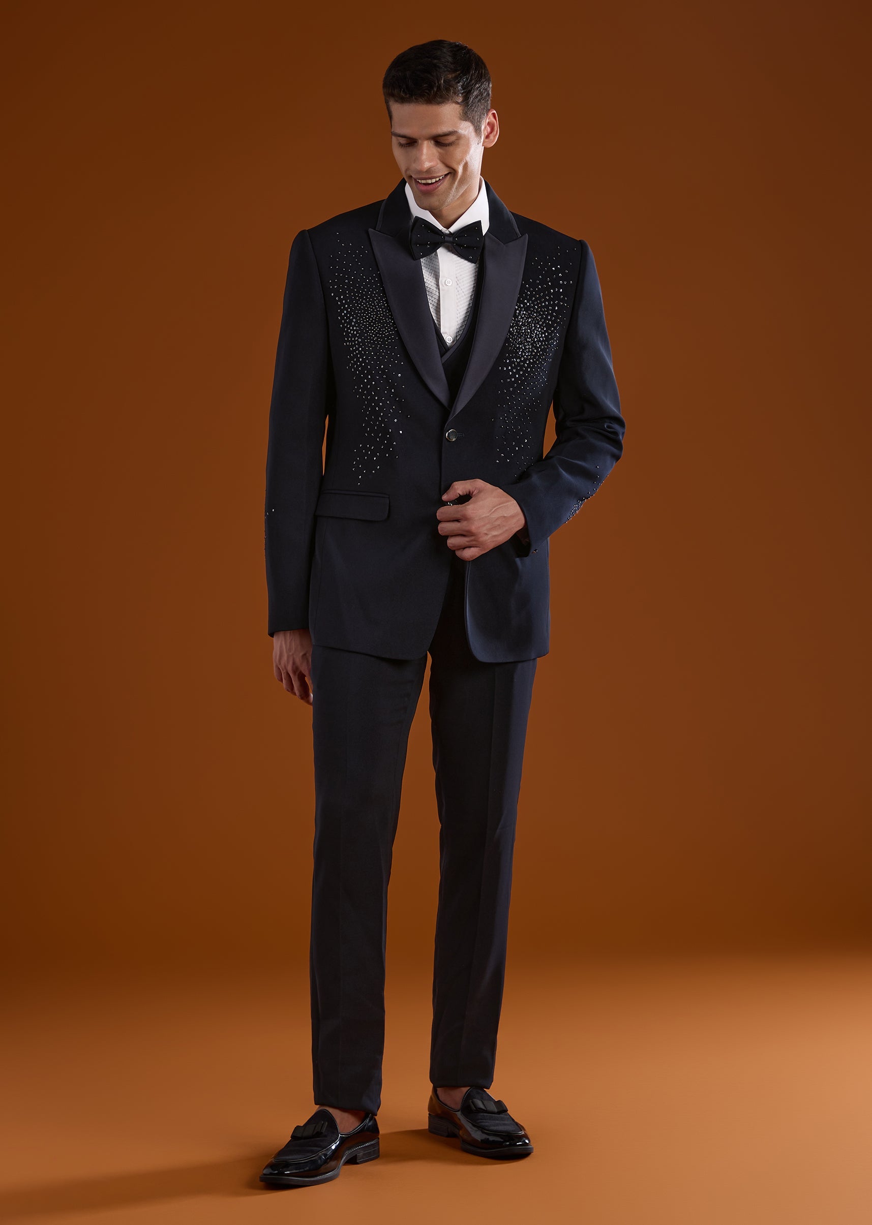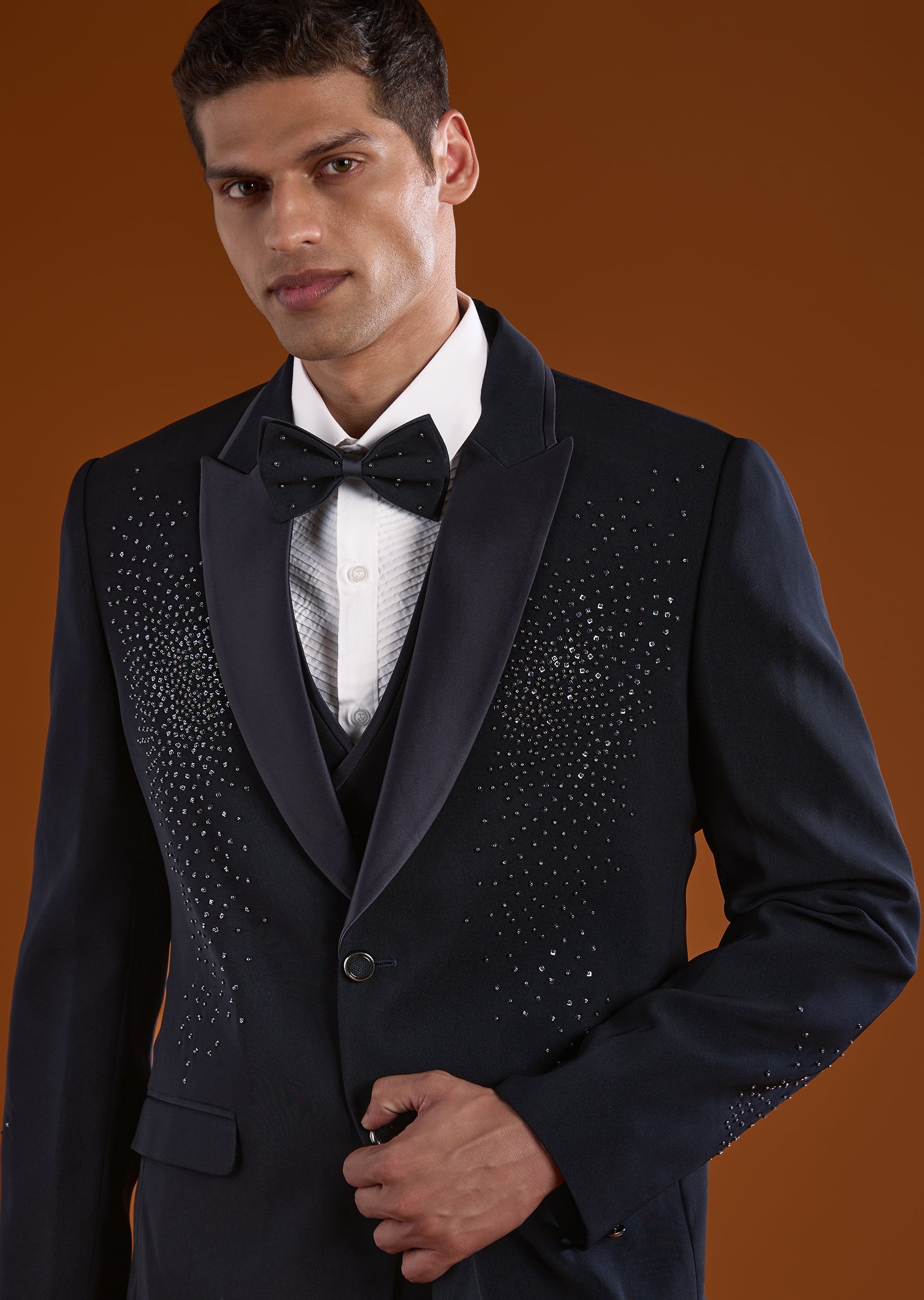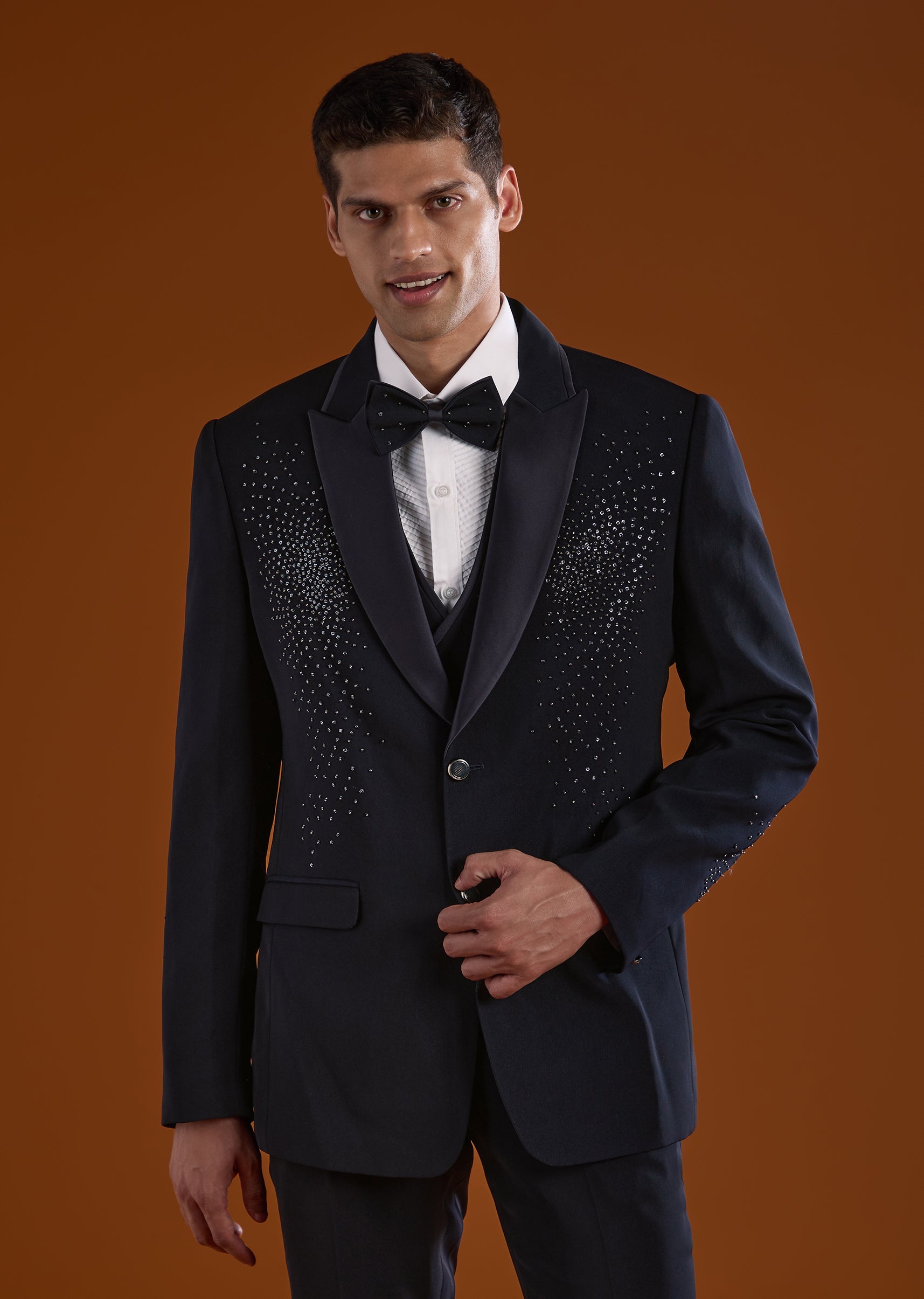 A refined blue tuxedo designed for reception and cocktail celebrations, perfect for groomsmen seeking a statement evening look. Accented with elegant stone work, it adds subtle sparkle while maintaining a clean sophisticated appeal. The full sleeves and mandarin collar create a sharp structured silhouette, ideal for modern wedding festivities. Awarded as the Most Trusted Brand, we're delivering styles you love, just as promised.