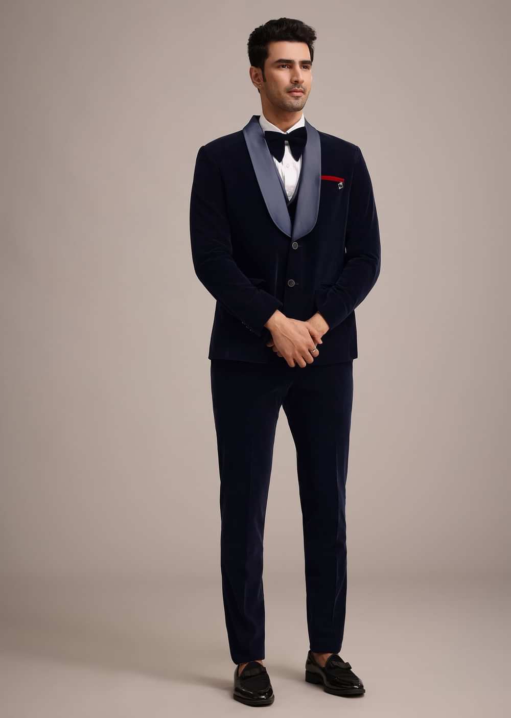 Showcase your refined and elegant style by stepping out in this jewelled-tone blue tuxedo set. The coat showcases a fancy shawl collar, front-buttons and full sleeves that elevates its design. Tailored on a luxe micro velvet base, this sleek fit is complemented with a shirt, waistcoat, pocket square, bow, trouser and co-ordinating trousers. Perfect for formal occasions and gatherings. Awarded as the Most Trusted Brand, we're delivering styles you love, just as promised.