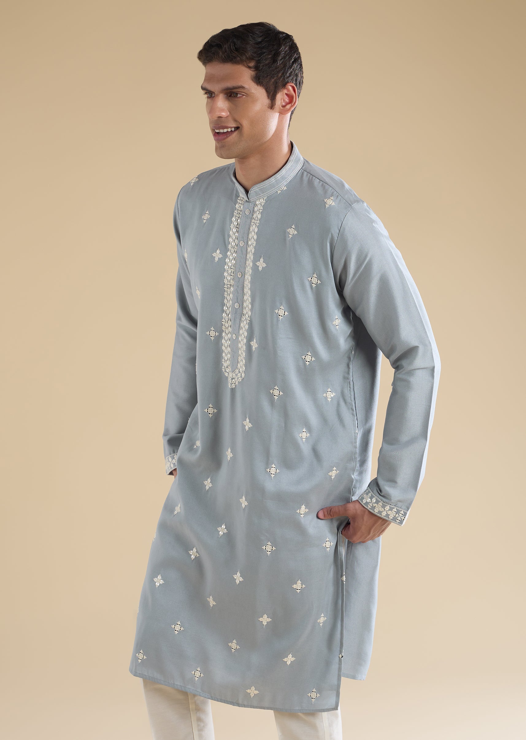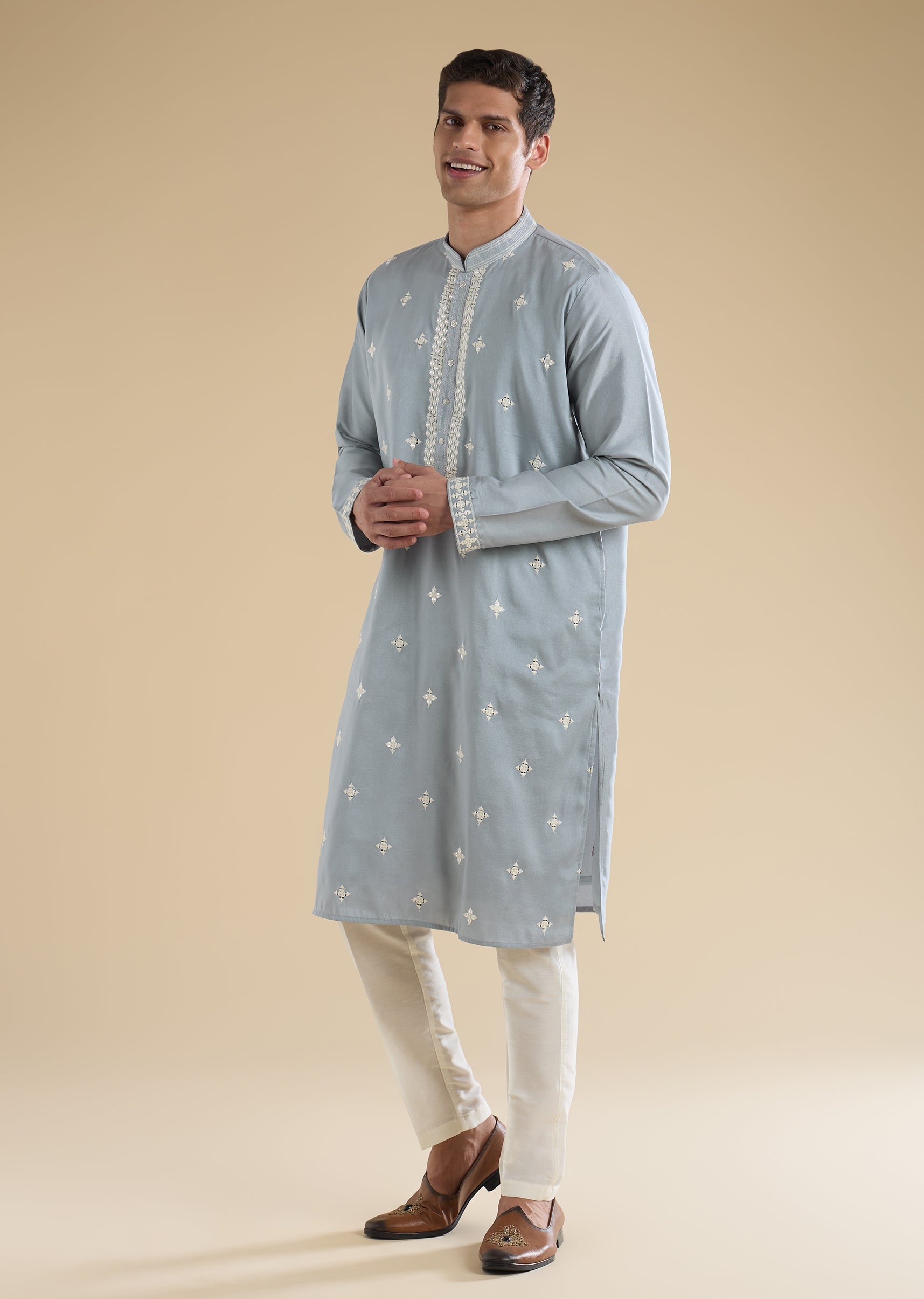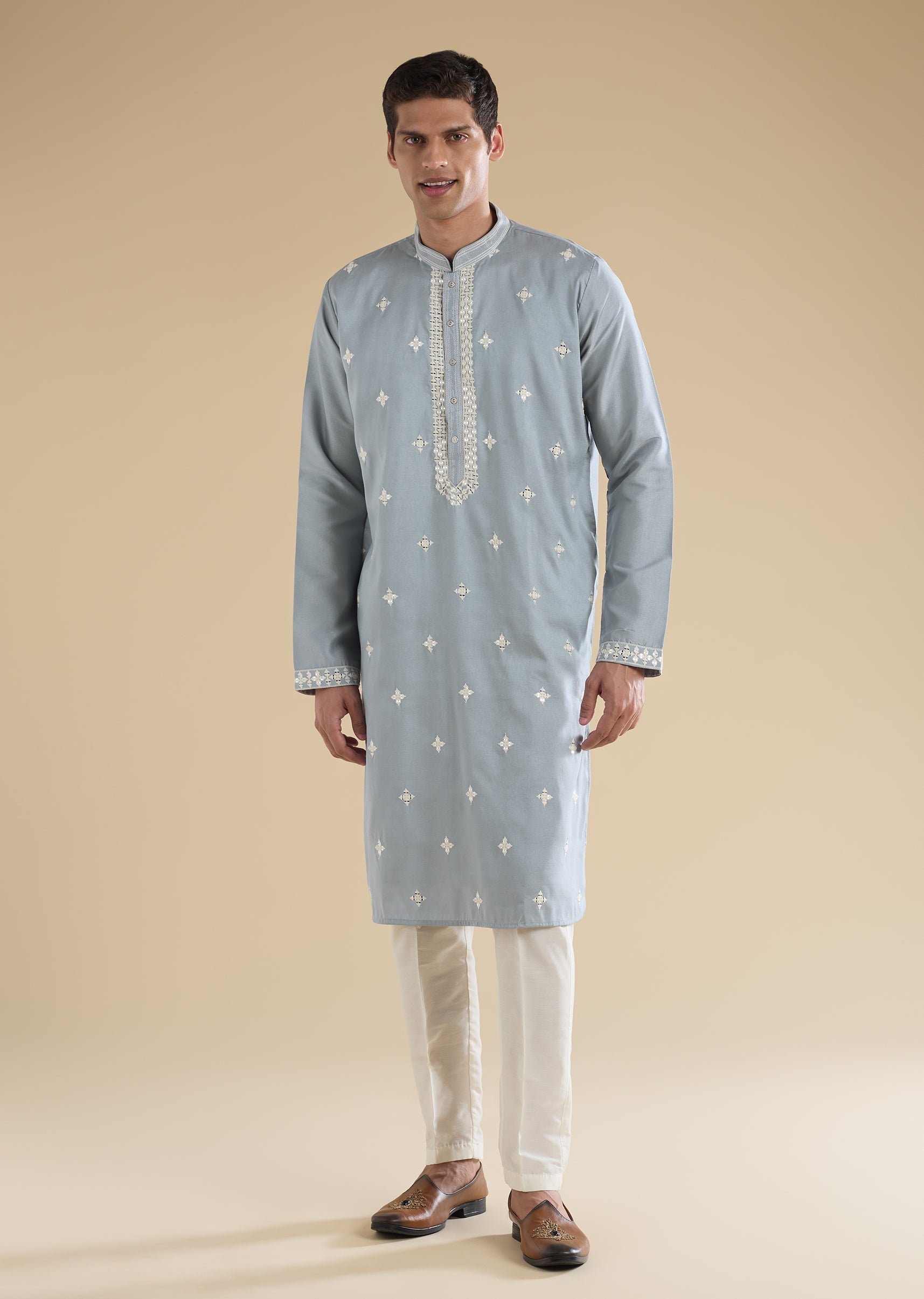 A comfortable blue art-silk kurta set with thread and mirror accents—easy festive-casual dressing. Styled with mandarin collar, full sleeves, and front button closure, paired with straight mid-waist pants—great for low-key celebrations.