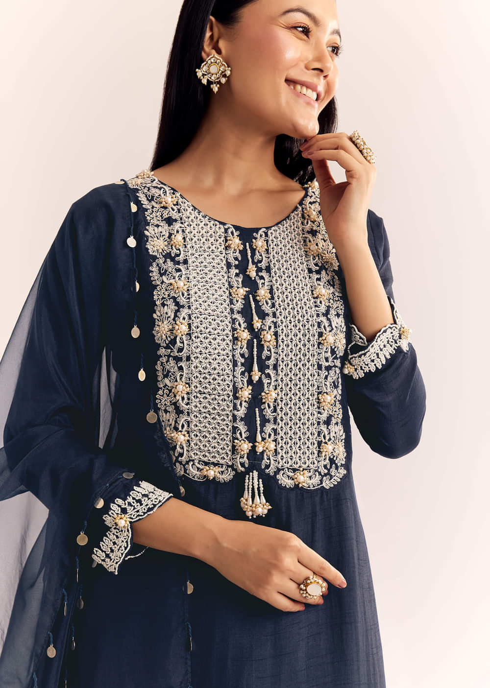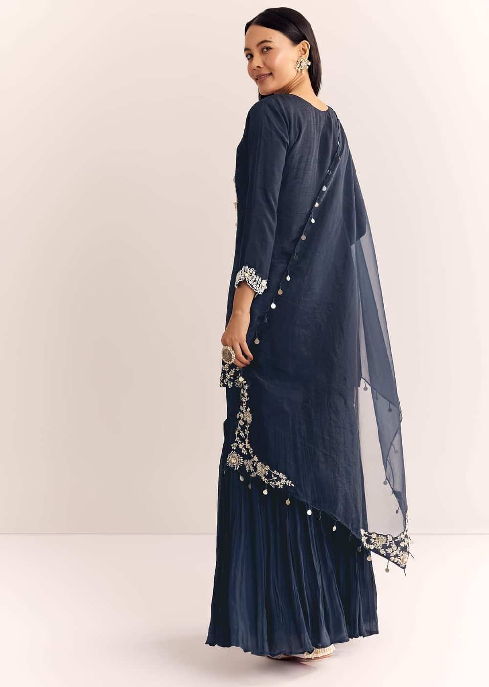Blue Moti Threadwork Dola Silk Sharara Suit With Organza Dupatta