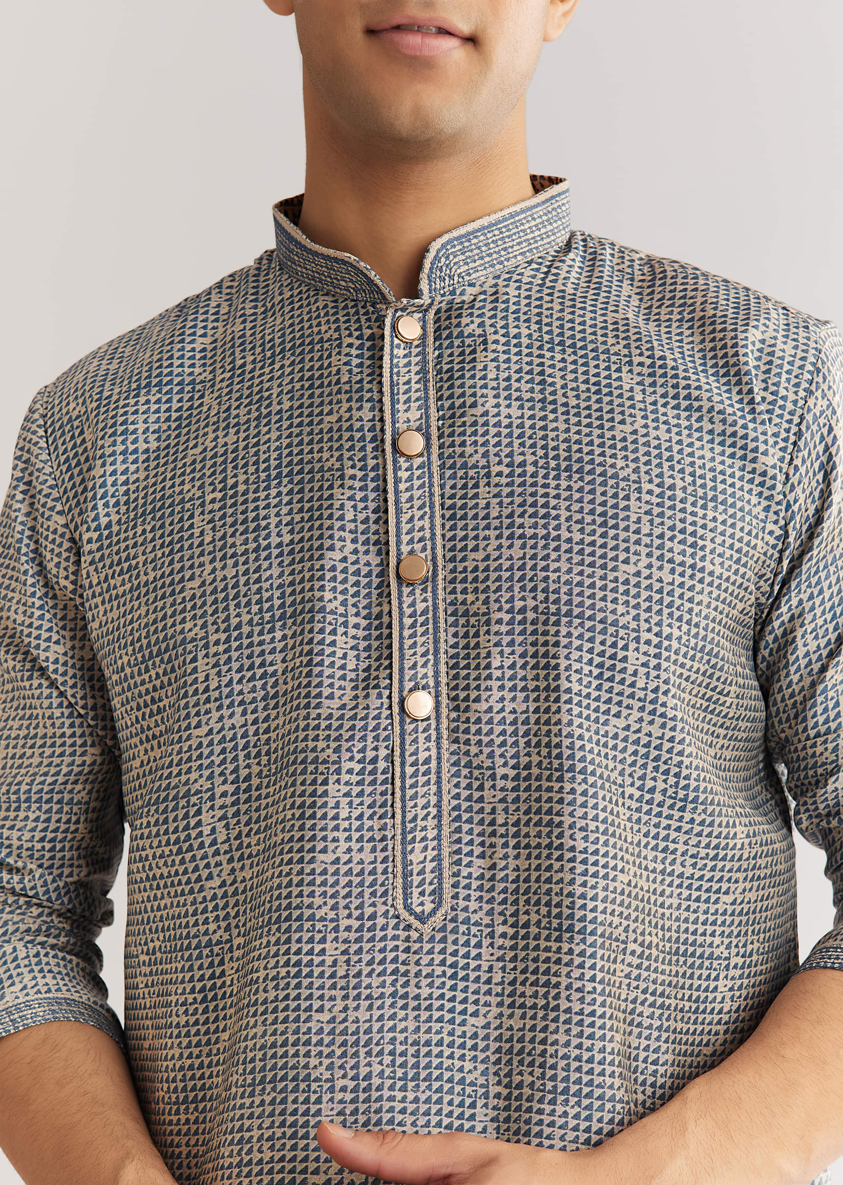 Blue Muslin Kurta Set With Mandarin Collar