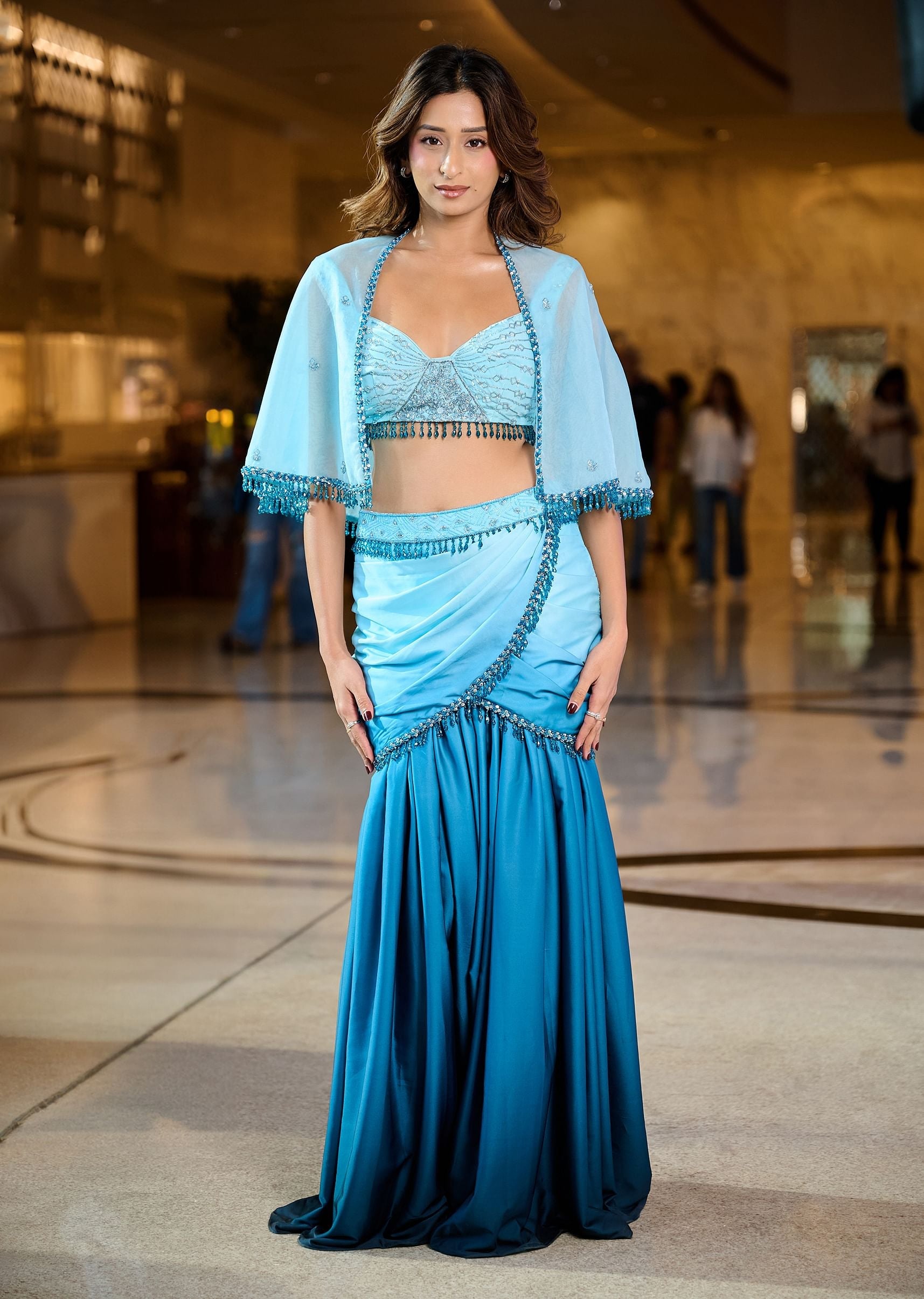 Blue Ombre Draped Skirt With Blouse And Tassel Lace Cape
