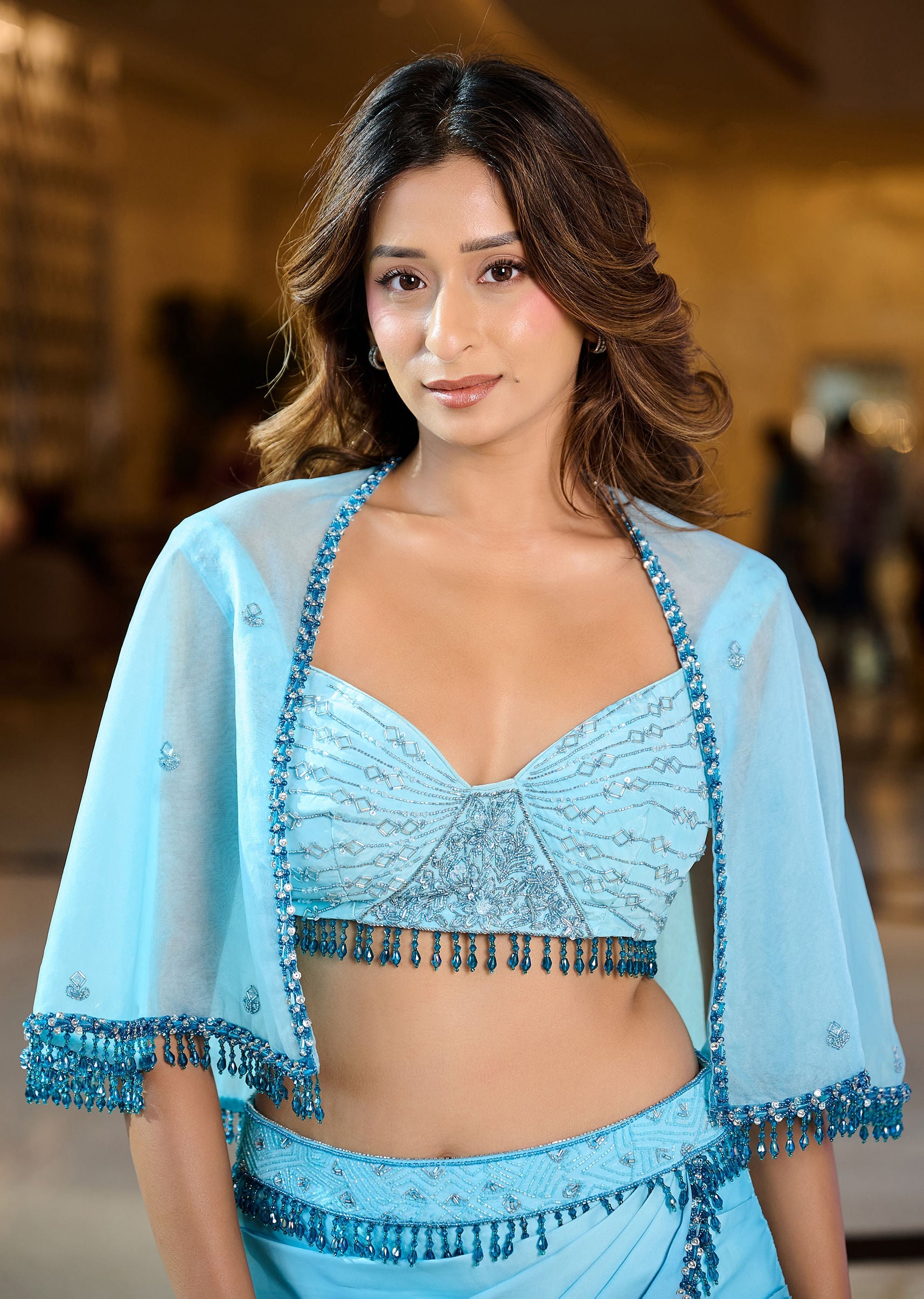 Add a burst of refreshing hues to your ethnic wardrobe with our shades of blue skirt ensemble. Fabricated from imported satin, this ensemble features a ombre pattern, asymmetric draped skirt elevated with an encrusted belt. Decorated with vibrant cutdana and salli work, the embroidered cape with lace detailing add a sophisticated texture. Completed with a V-neck embellished blouse, it boasts of hanging tassels. Awarded as the Most Trusted Brand, we're delivering styles you love, just as promised.
