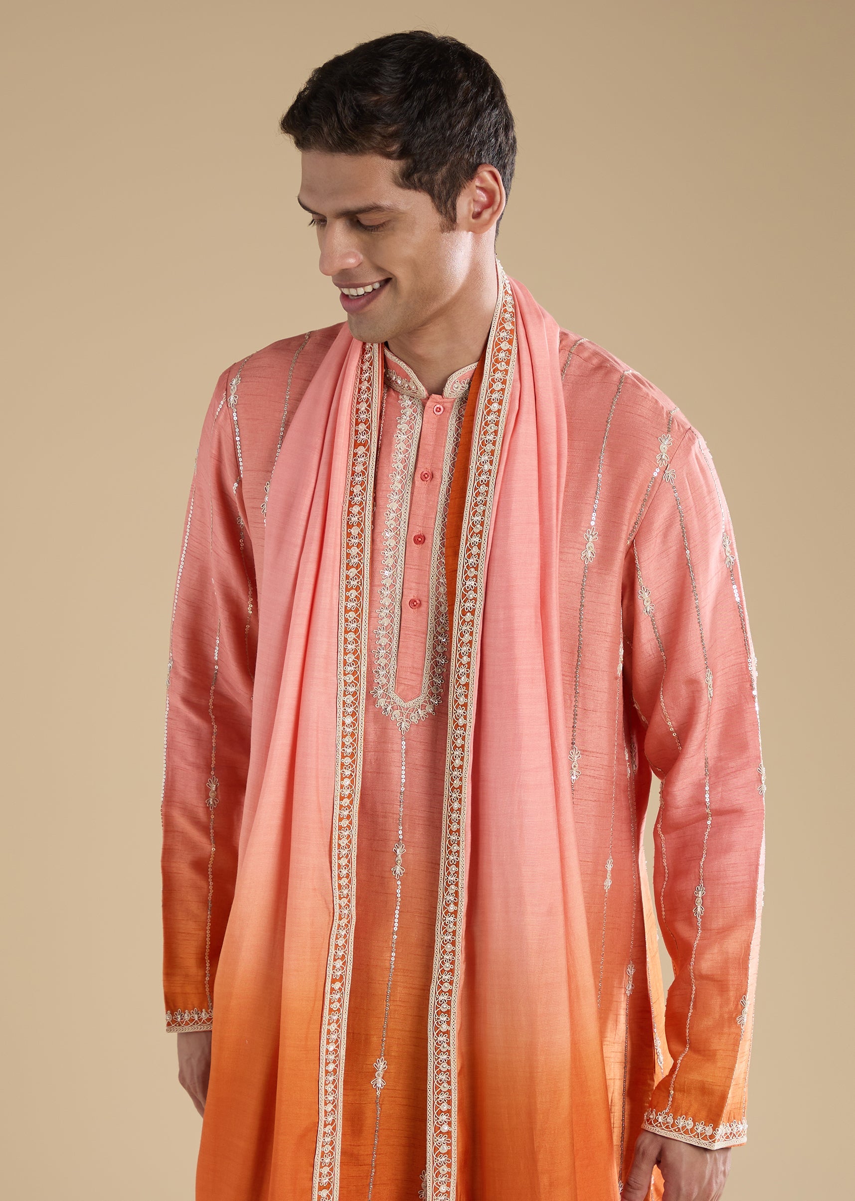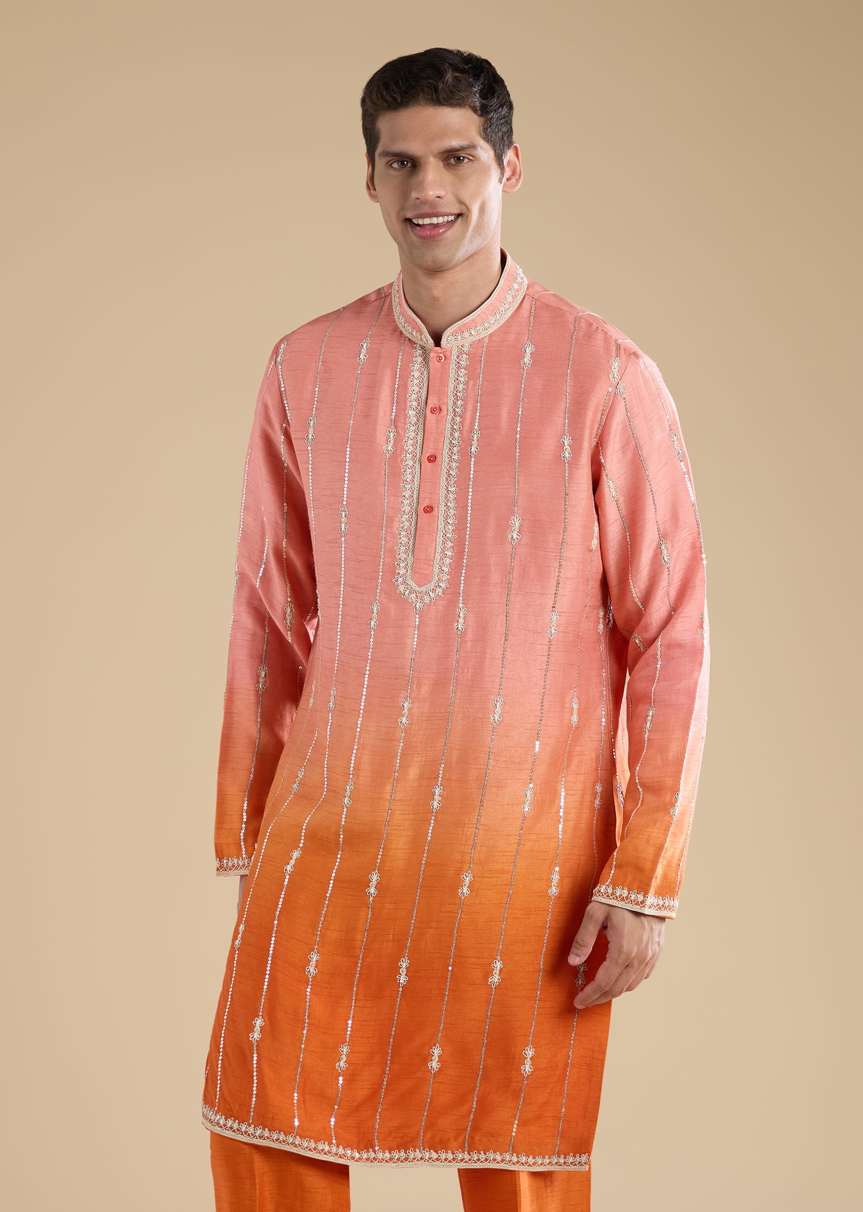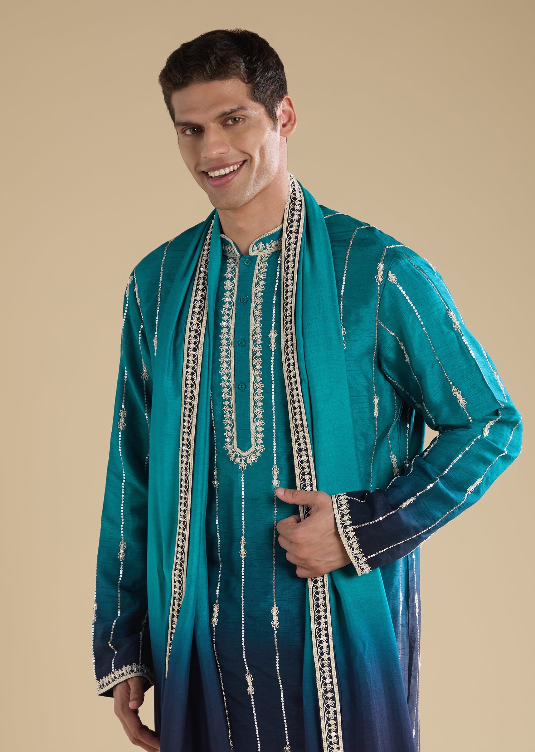 Crafted in a silk-blend, this blue kurta set features dori work with bead and sequin embellishments. Designed with a mandarin collar, full sleeves and front button with hook-eye closure, it... More Product Details
