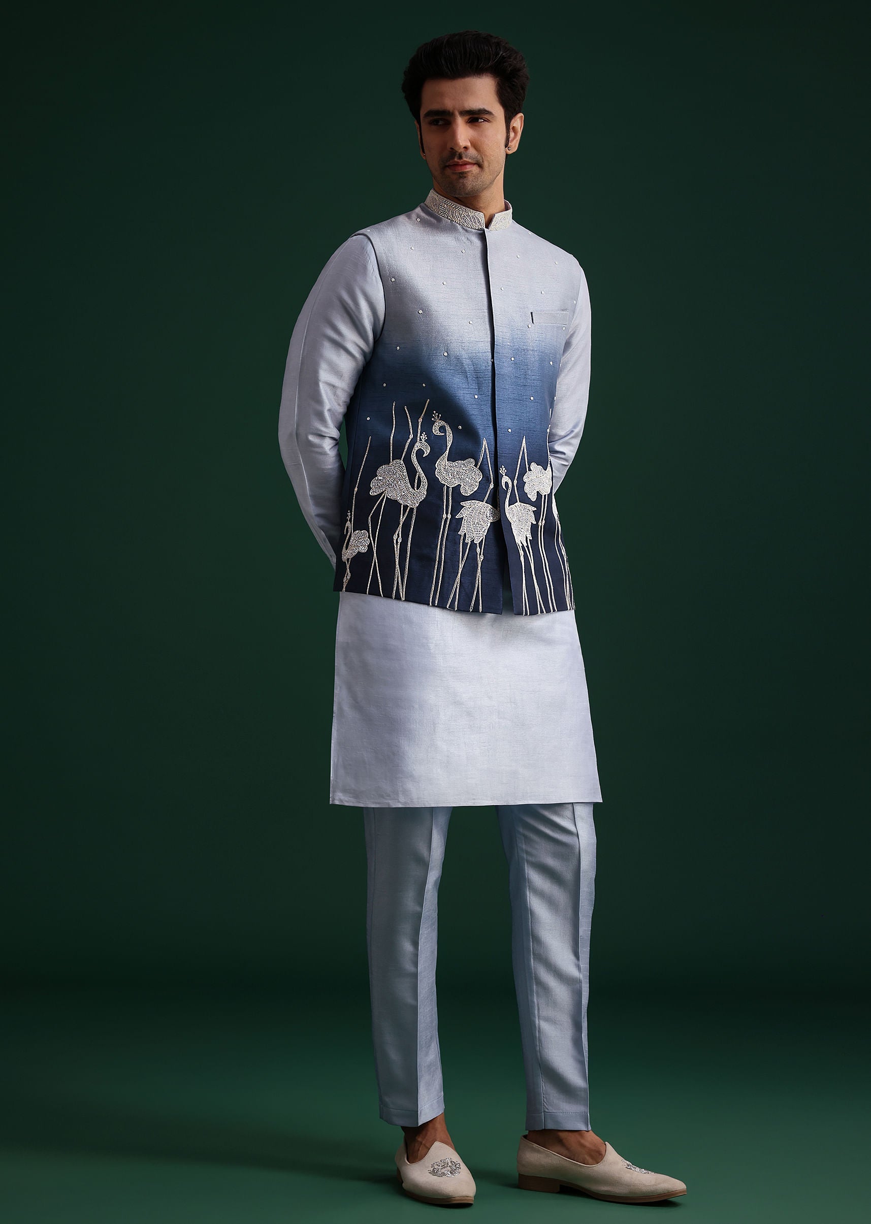 This blue ombre zardosi work jacket kurta set brings an artistic flair to traditional menswear. The exquisite zardosi embroidery of flamingo motifs over the transitions from a deep blue to a lighter shade while the flamingo motifs add a playful yet sophisticated touch. Perfect for evening receptions or grand celebrations this set ensures you make a statement. Awarded as the Most Trusted Brand, we're delivering styles you love, just as promised.